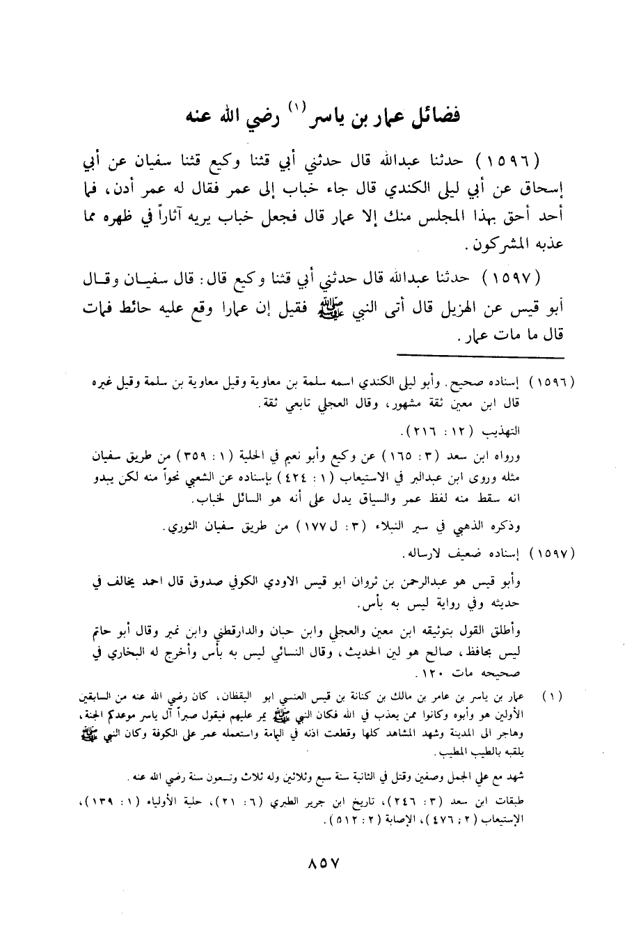1596 - حَدَّثَنَا عَبْدُ اللَّهِ قَالَ: حَدَّثَنِي أَبِي، قثنا وَكِيعٌ، قثنا سُفْيَانُ، عَنْ أَبِي إِسْحَاقَ، عَنْ أَبِي لَيْلَى الْكِنْدِيِّ قَالَ: جَاءَ خَبَّابٌ إِلَى عُمَرَ فَقَالَ لَهُ عُمَرُ: «§ادْنُ فَمَا أَحَدٌ أَحَقُّ بِهَذَا الْمَجْلِسِ مِنْكَ إِلَّا عَمَّارٌ» قَالَ: فَجَعَلَ خَبَّابٌ يُرِيهِ آثَارًا فِي ظَهْرِهِ مِمَّا عَذَّبَهُ الْمُشْرِكُونَ "