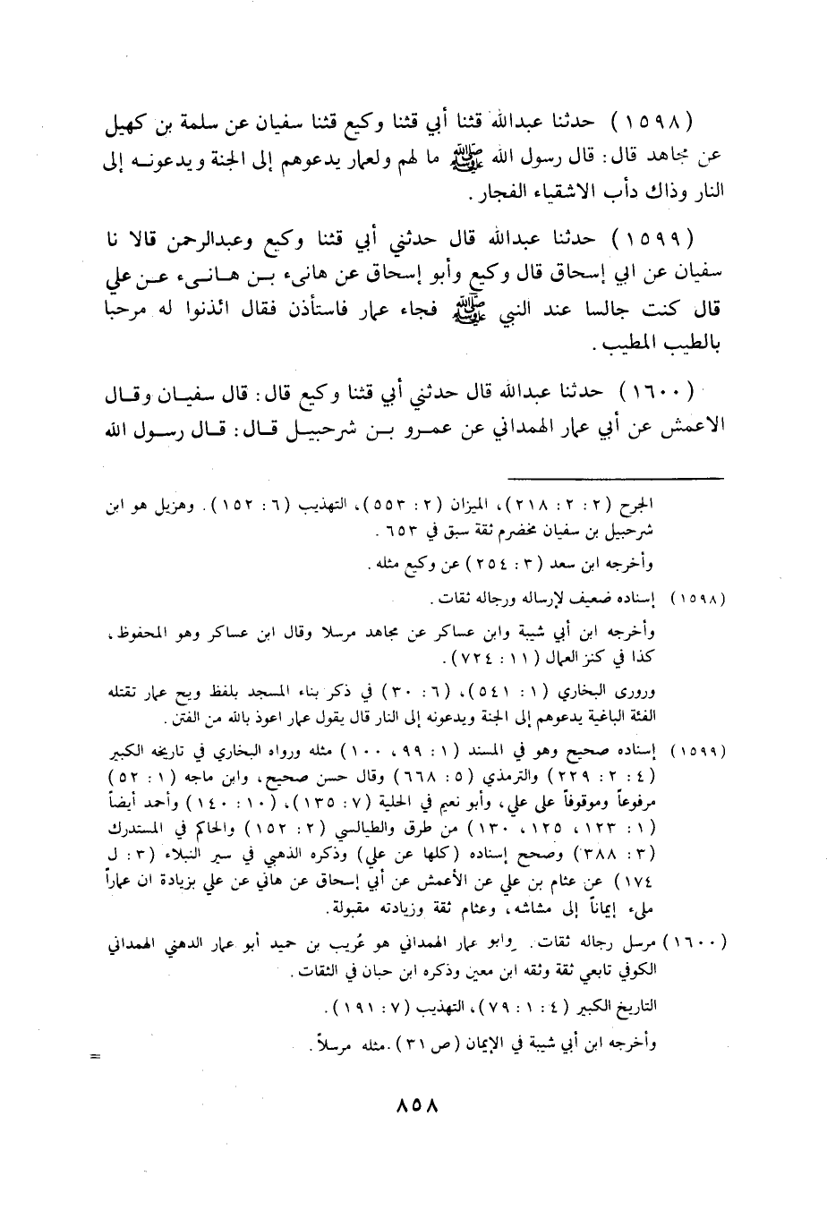1599 - حَدَّثَنَا عَبْدُ اللَّهِ قَالَ: حَدَّثَنِي أَبِي، قثنا وَكِيعٌ، وَعَبْدُ الرَّحْمَنِ قَالَا: نا سُفْيَانُ، عَنْ أَبِي إِسْحَاقَ قَالَ وَكِيعٌ، وَأَبُو إِسْحَاقَ، عَنْ هَانِئِ بْنِ هَانِئٍ، عَنْ عَلِيٍّ قَالَ: كُنْتُ جَالِسًا عِنْدَ النَّبِيِّ صَلَّى اللهُ عَلَيْهِ وَسَلَّمَ فَجَاءَ عَمَّارٌ فَاسْتَأْذَنَ، فَقَالَ: «§ائْذَنُوا لَهُ، مَرْحَبًا بِالطَّيِّبِ الْمُطَيَّبِ» .