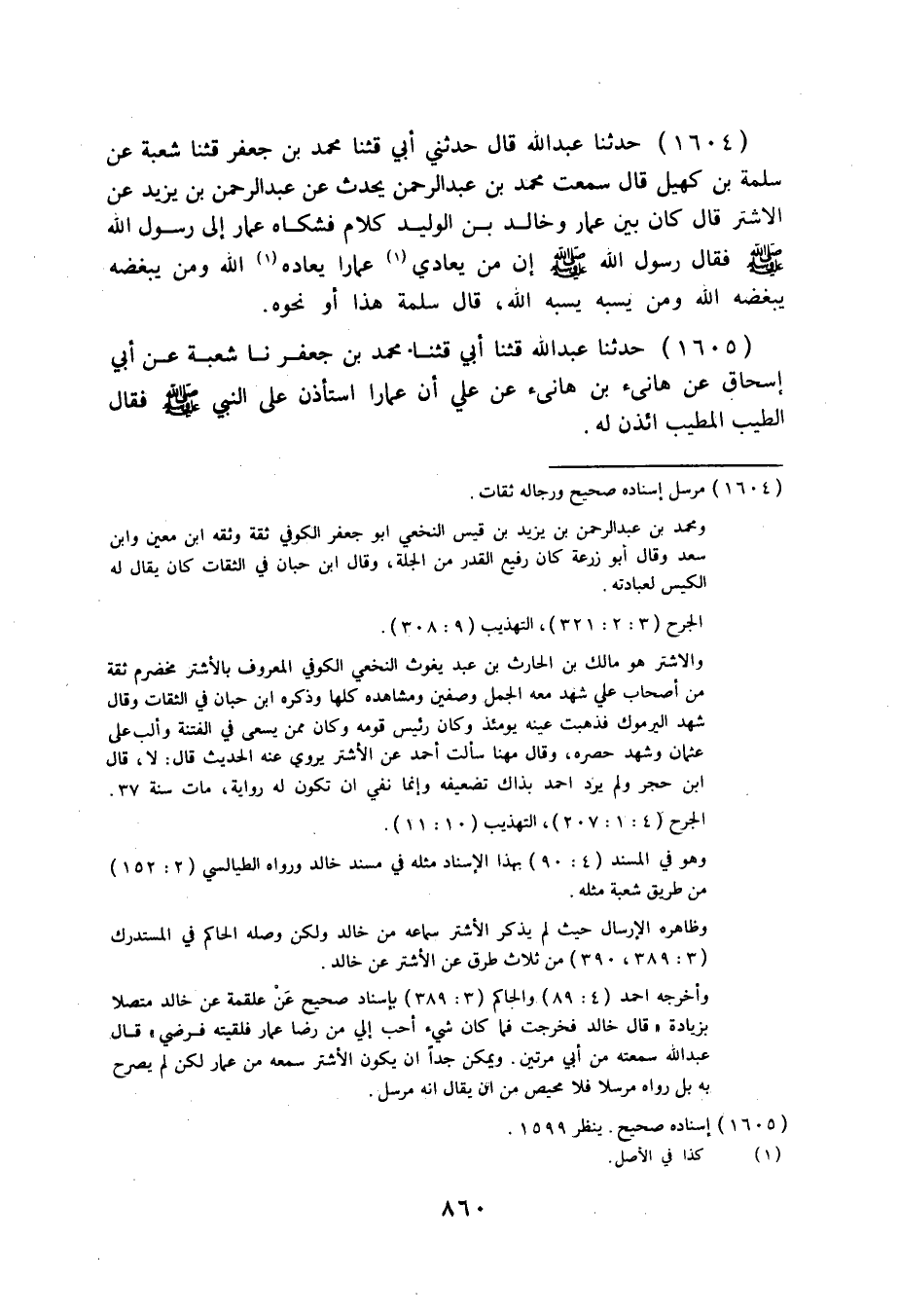 1604 - حَدَّثَنَا عَبْدُ اللَّهِ قَالَ: حَدَّثَنِي أَبِي، قثنا مُحَمَّدُ بْنُ جَعْفَرٍ قثنا شُعْبَةُ، عَنْ سَلَمَةَ بْنِ كُهَيْلٍ قَالَ: سَمِعْتُ مُحَمَّدَ بْنَ عَبْدِ الرَّحْمَنِ، يُحَدِّثُ عَنْ عَبْدِ الرَّحْمَنِ بْنِ يَزِيدَ، عَنِ الْأَشْتَرِ قَالَ: كَانَ بَيْنَ عَمَّارٍ، وَخَالِدِ بْنِ الْوَلِيدِ كَلَامٌ فَشَكَاهُ عَمَّارٌ إِلَى رَسُولِ اللَّهِ صَلَّى اللهُ عَلَيْهِ وَسَلَّمَ فَقَالَ رَسُولُ اللَّهِ صَلَّى اللهُ عَلَيْهِ وَسَلَّمَ: «§إِنَّ مَنْ يُعَادِ عَمَّارًا يُعَادِهِ اللَّهُ، وَمَنْ يُبْغِضْهُ يُبْغِضْهُ اللَّهُ، وَمَنْ يَسُبَّهُ يَسُبَّهُ اللَّهُ» قَالَ سَلَمَةُ هَذَا أَوْ نَحْوَهُ.