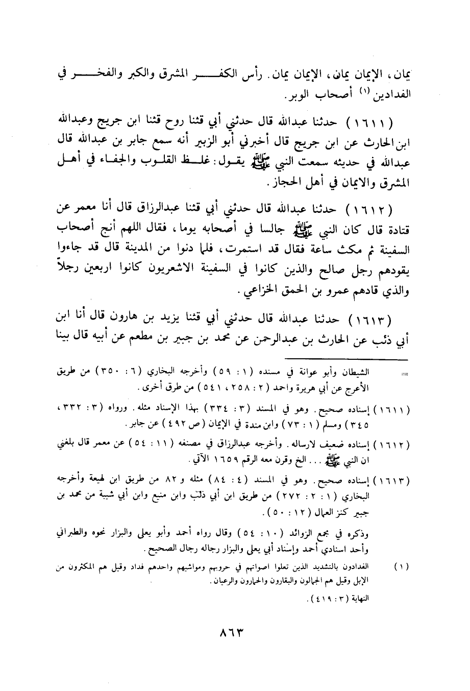 1611 - حَدَّثَنَا عَبْدُ اللَّهِ قَالَ: حَدَّثَنِي أَبِي، قثنا رَوْحٌ قثنا ابْنُ جُرَيْجٍ، وَعَبْدُ اللَّهِ بْنُ الْحَارِثِ، عَنِ ابْنِ جُرَيْجٍ قَالَ: أَخْبَرَنِي أَبُو الزُّبَيْرِ، أَنَّهُ سَمِعَ جَابِرَ بْنَ عَبْدِ اللَّهِ قَالَ عَبْدُ اللَّهِ فِي حَدِيثِهِ: سَمِعْتُ النَّبِيَّ صَلَّى اللهُ عَلَيْهِ وَسَلَّمَ يَقُولُ «§غِلْظُ الْقُلُوبِ وَالْجَفَاءُ فِي أَهْلِ الْمَشْرِقِ، وَالْإِيمَانُ فِي أَهْلِ الْحِجَازِ» .