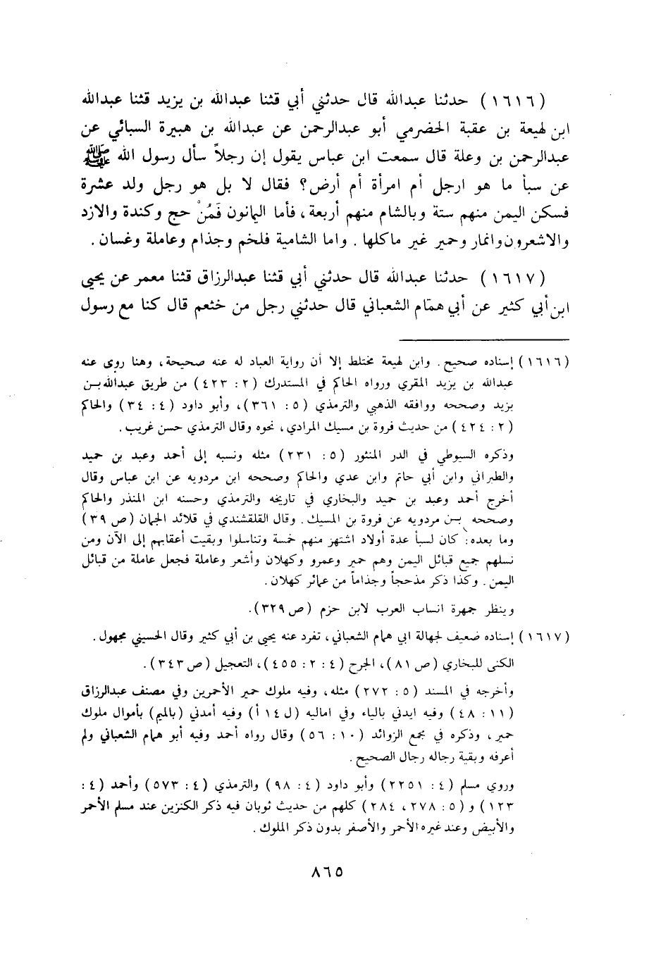 1616 - حَدَّثَنَا عَبْدُ اللَّهِ قَالَ: حَدَّثَنِي أَبِي، قثنا عَبْدُ اللَّهِ بْنُ يَزِيدَ قثنا عَبْدُ اللَّهِ بْنُ لَهِيعَةَ بْنِ عُقْبَةَ الْحَضْرَمِيُّ أَبُو عَبْدِ الرَّحْمَنِ، عَنْ عَبْدِ اللَّهِ بْنِ هُبَيْرَةَ السَّبَائِيِّ، عَنْ عَبْدِ الرَّحْمَنِ بْنِ وَعْلَةَ قَالَ: سَمِعْتُ ابْنَ عَبَّاسٍ يَقُولُ: إِنَّ رَجُلًا سَأَلَ رَسُولَ اللَّهِ صَلَّى اللهُ عَلَيْهِ وَسَلَّمَ عَنْ §سَبَأٍ مَا هُوَ أَرَجُلٌ أَمِ امْرَأَةٌ أَمْ أَرْضٌ؟ فَقَالَ: «لَا بَلْ هُوَ رَجُلٌ وَلَدَ عَشَرَةً فَسَكَنَ الْيَمَنَ مِنْهُمْ سِتَّةٌ، وَبِالشَّامِ مِنْهُمْ أَرْبَعَةٌ، فَأَمَّا الْيَمَانُونَ فَمَذْحِجٌ، وَكِنْدَةُ، وَالْأَزْدُ، وَالْأَشْعَرُونَ، وَأنْمَارٌ، وَحِمْيَرُ غَيْرُ مَاكلها. وَأَمَّا الشَّامِيَّةُ فَلَخْمٌ، وَجُذَامٌ، وَعَامِلَةُ، وَغَسَّانُ» .