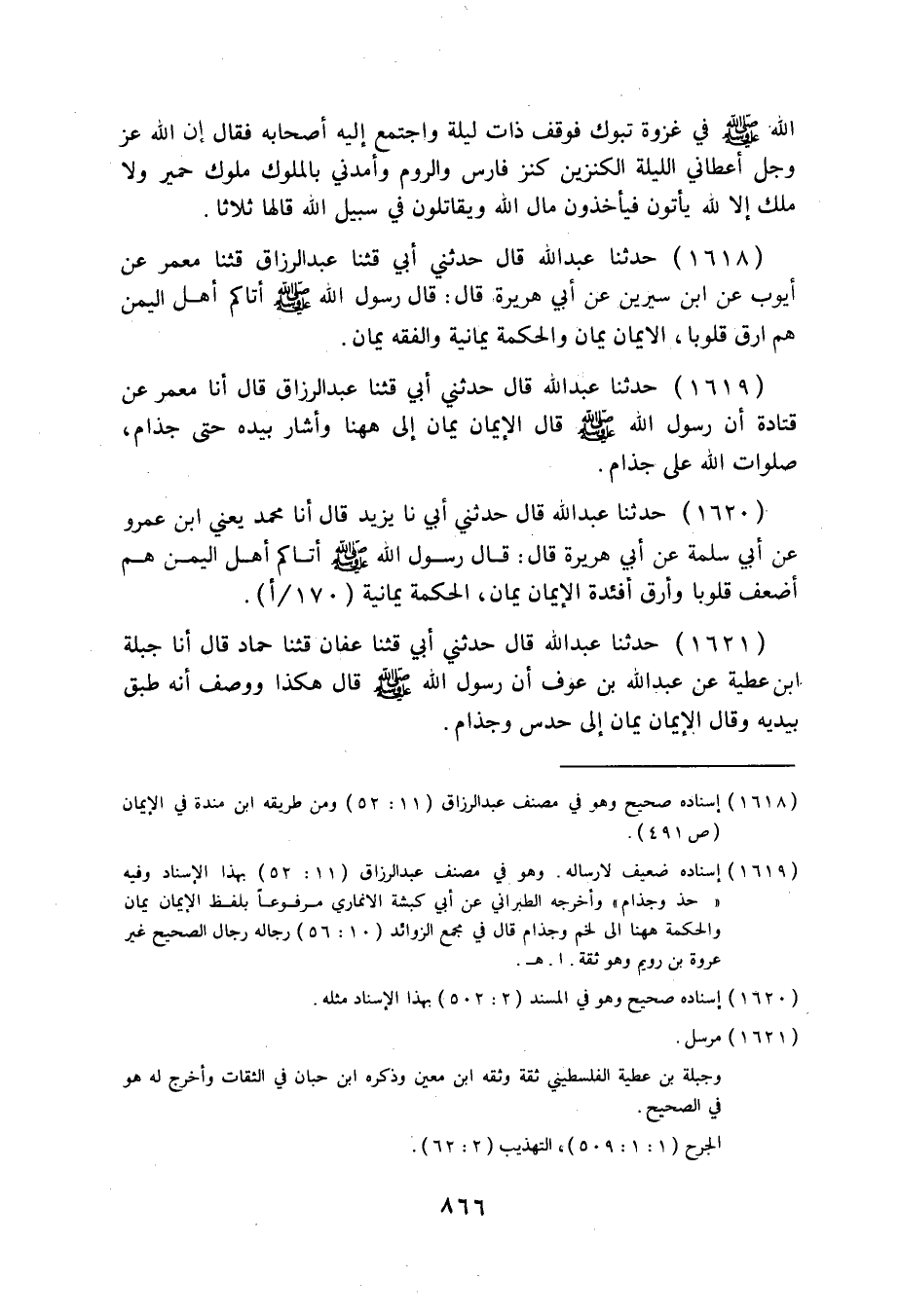 1619 - حَدَّثَنَا عَبْدُ اللَّهِ قَالَ: حَدَّثَنِي أَبِي، قثنا عَبْدُ الرَّزَّاقِ قَالَ: أنا مَعْمَرٌ، عَنْ قَتَادَةَ، أَنَّ. رَسُولَ اللَّهِ صَلَّى اللهُ عَلَيْهِ وَسَلَّمَ قَالَ: «§الْإِيمَانُ يَمَانٍ، إِلَى هَهُنَا وَأَشَارَ بِيَدِهِ حَتَّى جُذَامَ صَلَوَاتِ اللَّهِ عَلَى جُذَامَ» .