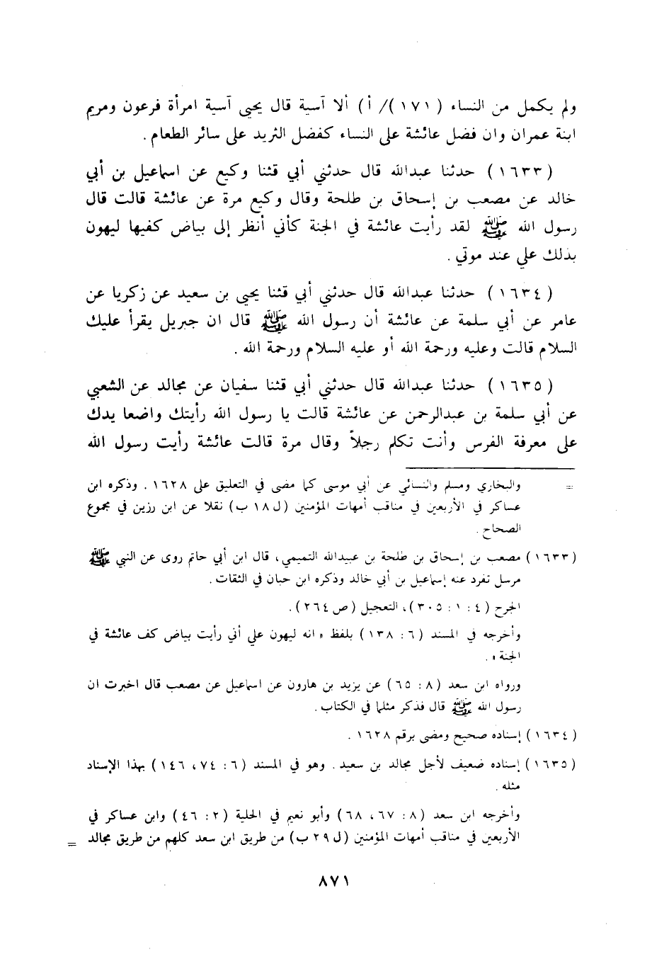 1633 - حَدَّثَنَا عَبْدُ اللَّهِ قَالَ: حَدَّثَنِي أَبِي، قثنا وَكِيعٌ، عَنْ إِسْمَاعِيلَ بْنِ أَبِي خَالِدٍ، عَنْ مُصْعَبِ بْنِ إِسْحَاقَ بْنِ طَلْحَةَ وَقَالَ وَكِيعٌ مَرَّةَ: عَنْ عَائِشَةَ قَالَتْ: قَالَ رَسُولُ اللَّهِ صَلَّى اللهُ عَلَيْهِ وَسَلَّمَ: «§لَقَدْ رَأَيْتُ عَائِشَةَ فِي الْجَنَّةِ كَأَنِّي أَنْظُرُ إِلَى بَيَاضِ كَفَّيْهَا، لَيُهَوَّنُ بِذَلِكَ عَلَيَّ عِنْدَ مَوْتِي» .