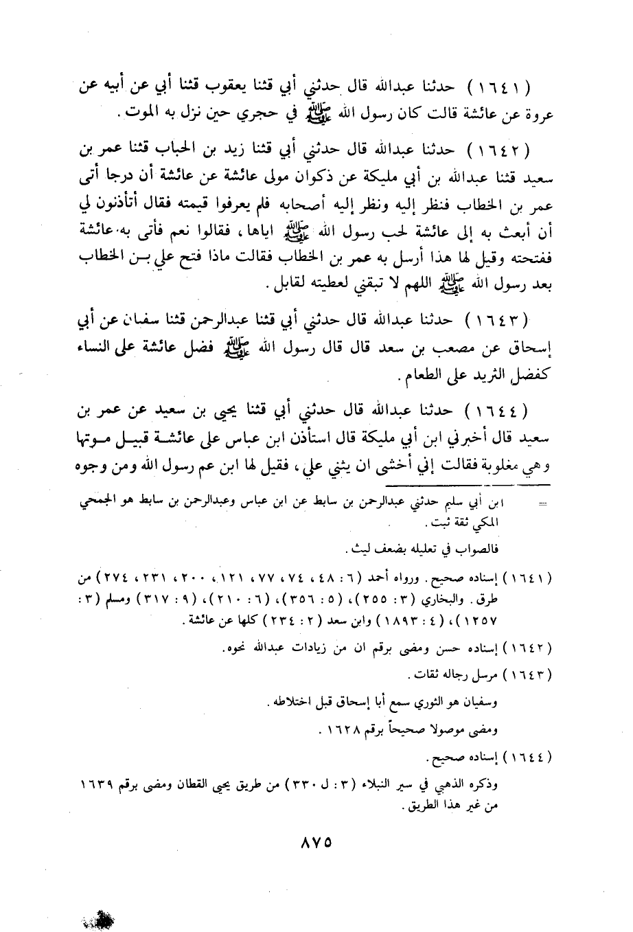 1644 - حَدَّثَنَا عَبْدُ اللَّهِ قَالَ: حَدَّثَنِي أَبِي، قثنا يَحْيَى بْنُ سَعِيدٍ، عَنْ عُمَرَ بْنِ سَعِيدٍ قَالَ: أَخْبَرَنِي ابْنُ أَبِي مُلَيْكَةَ قَالَ: اسْتَأْذَنَ ابْنُ عَبَّاسٍ، عَلَى عَائِشَةَ قُبَيْلَ مَوْتِهَا وَهِيَ مَغْلُوبَةٌ فَقَالَتْ: إِنِّي أَخْشَى أَنْ يُثْنِي عَلَيَّ، فَقِيلَ لَهَا: ابْنُ عَمِّ رَسُولِ اللَّهِ، وَمَنْ وُجُوهِ الْمُسْلِمِينَ قَالَتِ: ائْذَنُوا لَهُ، فَقَالَ: «كَيْفَ تَجِدِينَكِ يَا أُمَّهْ؟» قَالَتْ: بِخَيْرٍ إِنِ اتَّقَيْتُ قَالَ: «فَإِنَّكَ بِخَيْرٍ إِنْ شَاءَ اللَّهُ إِنِ اتَّقَيْتِ، §زَوْجَةُ رَسُولِ اللَّهِ صَلَّى اللهُ عَلَيْهِ وَسَلَّمَ وَلَمْ يَنْكِحْ بِكْرًا غَيْرَكَ وَنَزَلَ عُذْرُكِ مِنَ السَّمَاءِ» ، فَدَخَلَ ابْنُ الزُّبَيْرِ خِلَافَهُ، فَقَالَتْ: دَخَلَ ابْنُ عَبَّاسٍ فَأَثْنَى، وَدِدْتُ أَنِّي كُنْتُ نَسْيًا مَنْسِيًّا.