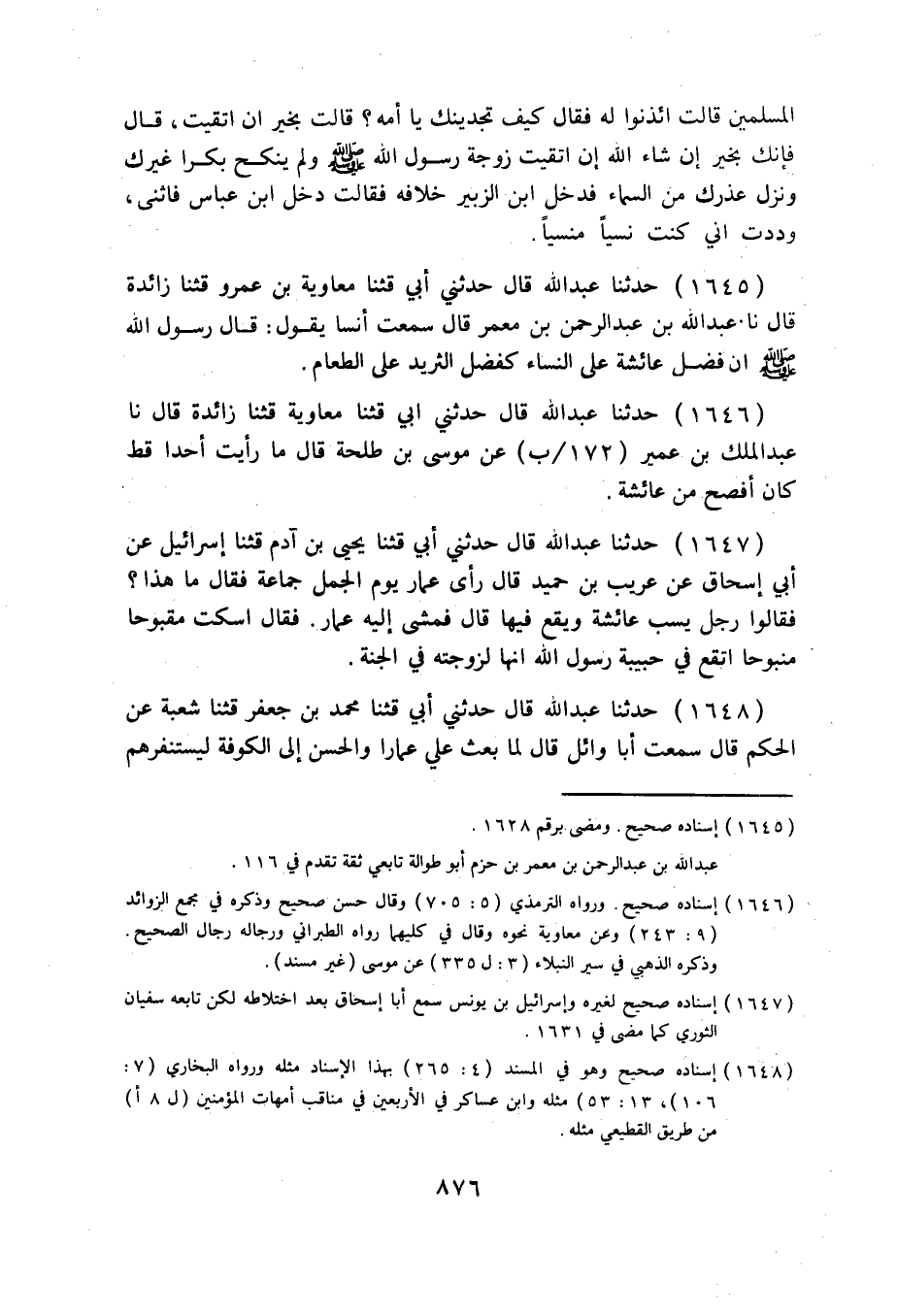 1645 - حَدَّثَنَا عَبْدُ اللَّهِ قَالَ: حَدَّثَنِي أَبِي، قثنا مُعَاوِيَةُ بْنُ عَمْرٍو قثنا زَائِدَةُ نا عَبْدُ اللَّهِ بْنُ عَبْدِ الرَّحْمَنِ بْنِ مَعْمَرٍ قَالَ: سَمِعْتُ أَنَسًا يَقُولُ: قَالَ رَسُولُ اللَّهِ صَلَّى اللهُ عَلَيْهِ وَسَلَّمَ: «§إِنَّ فَضْلَ عَائِشَةَ عَلَى النِّسَاءِ، كَفَضْلِ الثَّرِيدِ عَلَى الطَّعَامِ» .