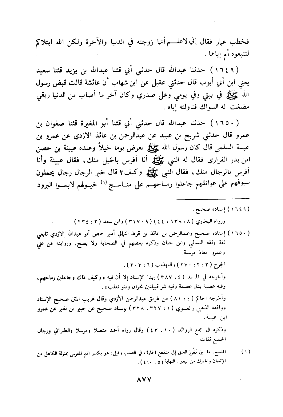 1650 - حَدَّثَنَا عَبْدُ اللَّهِ قَالَ: حَدَّثَنِي أَبِي، قثنا أَبُو الْمُغِيرَةِ، قثنا صَفْوَانُ بْنُ عَمْرٍو قَالَ: حَدَّثَنِي شُرَيْحُ بْنُ عُبَيْدٍ، عَنْ عَبْدِ الرَّحْمَنِ بْنِ عَائِذٍ الْأَزْدِيِّ، عَنْ عَمْرِو بْنِ عَبْسَةَ السُّلَمِيِّ قَالَ: كَانَ رَسُولُ اللَّهِ صَلَّى اللهُ عَلَيْهِ وَسَلَّمَ يَعْرِضُ يَوْمًا خَيْلًا وَعِنْدَهُ عُيَيْنَةُ بْنُ حِصْنِ بْنِ بَدْرٍ الْفَزَارِيِّ فَقَالَ لَهُ النَّبِيُّ صَلَّى اللهُ عَلَيْهِ وَسَلَّمَ: «أَنَا أَفْرَسُ بِالْخَيْلِ مِنْكَ» ، فَقَالَ عُيَيْنَةُ: وَأَنَا أَفْرَسُ بِالرِّجَالِ مِنْكَ، فَقَالَ النَّبِيُّ صَلَّى اللهُ عَلَيْهِ وَسَلَّمَ: «وَكَيْفَ؟» قَالَ: خَيْرُ الرِّجَالِ رِجَالٌ يَحْمِلُونَ سُيُوفَهُمْ عَلَى عَوَاتِقِهِمْ جَاعِلُوا رِمَاحَهُمْ عَلَى مَنَاسِجِ خُيُولِهِمْ لِابِسُوا الْبُرُودَ مِنْ أَهْلِ نَجْدٍ، فَقَالَ رَسُولُ اللَّهِ صَلَّى اللهُ عَلَيْهِ وَسَلَّمَ: «كَذَبْتَ بَلْ §خَيْرُ الرِّجَالِ رِجَالُ أَهْلِ الْيَمَنِ، وَالْإِيمَانُ يَمَانٌ إِلَى لَخْمٍ، وَجُذَامَ، وَعَامِلَةَ، وَمَأْكُولُ حِمْيَرَ خَيْرٌ مِنْ آكِلِهَا وَحَضْرَمُوتَ خَيْرٌ مِنْ بَنِي الْحَارِثِ، وَقَبِيلَةٌ خَيْرٌ مِنْ قَبِيلَةٍ، وَقَبِيلَةٌ شَرٌّ مِنْ قَبِيلَةٍ، وَاللَّهِ مَا أُبَالِي أَنْ يَهْلِكَ الْحَارِثَانِ كِلَاهُمَا، لَعَنَ اللَّهَ الْمُلُوكَ الْأَرْبَعَةَ جَمَدَاءَ، وَمُخُوسَا، وَمَشْرَحَا، وَأَبْضَعَةَ، وَأُخْتَهُمُ الْعَمَرَّدَةَ» ، ثُمَّ قَالَ: «أَمَرَنِي رَبِّي عَزَّ وَجَلَّ أَنْ أَلْعَنَ قُرَيْشًا مَرَّتَيْنِ، فَلَعَنْتُهُمْ، وَأَمَرَنِي أَنْ أُصَلِّيَ عَلَيْهِمْ مَرَّتَيْنِ، فَصَلَّيْتُ عَلَيْهِمْ مَرَّتَيْنِ، ثُمَّ لَعَنَ قَبَائِلَ فَسَمَّاهُمْ» ثُمَّ قَالَ: «عُصَيَّةُ عَصَتِ اللَّهَ وَرَسُولَهُ غَيْرَ قَيْسٍ، وَجَعْدَةَ، وَعِصْمَةَ» ، ثُمَّ قَالَ: «لَأَسْلَمُ، وَغِفَارُ، وَمُزَيْنَةُ، وَأَخْلَاطُهُمْ مِنْ جُهَيْنَةَ خَيْرٌ مِنْ بَنِي أَسَدٍ، وَتَمِيمٌ، وَغَطَفَانُ، وَهَوَازِنُ، عِنْدَ اللَّهِ يَوْمَ الْقِيَامَةِ» ، ثُمَّ قَالَ: «شَرُّ قَبِيلَتَيْنِ فِي الْعَرَبِ فَسَمَّاهُمَا وَأَكْثَرُ الْقَبَائِلِ فِي الْجَنَّةِ مِذْحَجٌ» . قَالَ صَفْوَانُ: وَمَأْكُولُ حِمْيَرَ خَيْرٌ مِنْ آكِلِهَا قَالَ: مَنْ مَضَى خَيْرٌ مِمَّنْ بَقِيَ