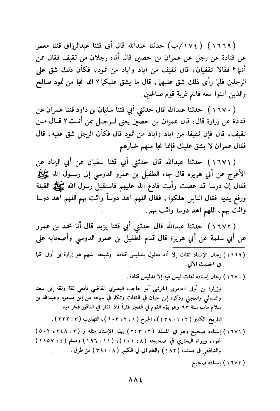 1670 - حَدَّثَنَا عَبْدُ اللَّهِ قَالَ: حَدَّثَنِي أَبِي، قثنا سُلَيْمَانُ بْنُ دَاوُدَ قثنا عِمْرَانُ، عَنْ قَتَادَةَ، عَنْ زُرَارَةَ قَالَ: قَالَ عِمْرَانُ بْنُ حُصَيْنٍ يَعْنِي لِرَجُلٍ: «مِمَّنْ أَنْتَ؟» قَالَ: مِنْ ثَقِيفٍ قَالَ: «فَإِنَّ §ثَقِيفًا، مِنْ إِيَادٍ، وَإِيَادٌ، مِنْ ثَمُودٍ» قَالَ: فَكَأَنَّ الرَّجُلُ شَقَّ عَلَيْهِ قَالَ: فَقَالَ عِمْرَانُ «لَا يَشُقُّ عَلَيْكَ، فَإِنَّمَا نَجَا مِنْهُمْ خِيَارُهُمْ» .