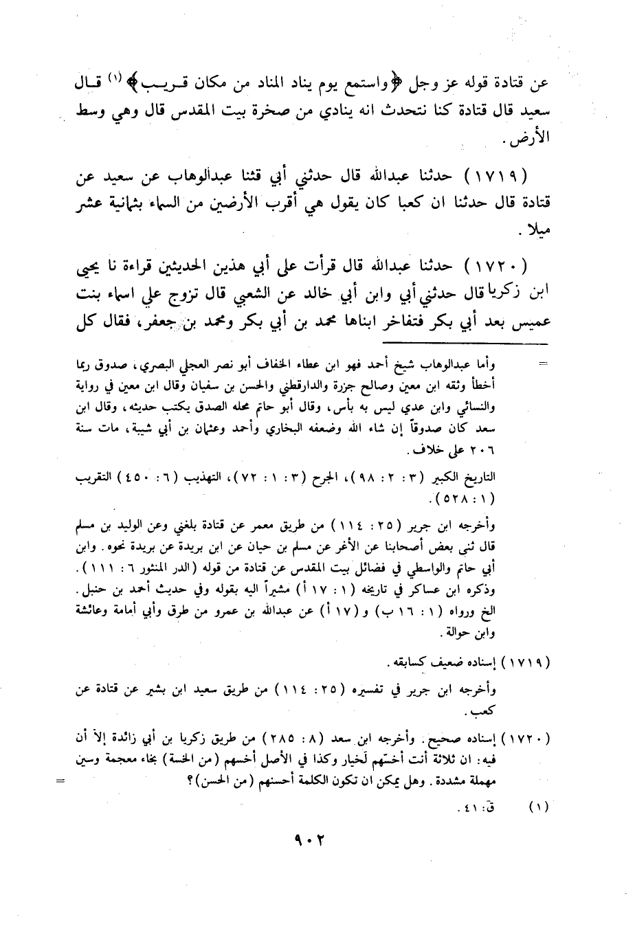 1719 - حَدَّثَنَا عَبْدُ اللَّهِ قَالَ: حَدَّثَنِي أَبِي، قثنا عَبْدُ الْوَهَّابِ، عَنْ سَعِيدٍ، عَنْ قَتَادَةَ قَالَ: حَدَّثَنَا أَنَّ كَعْبًا كَانَ يَقُولُ: «§هِيَ أَقْرَبُ الْأَرْضِينَ مِنَ السَّمَاءِ بِثَمَانِيَةَ عَشَرَ مِيلًا» .