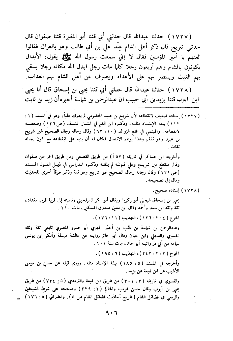 1727 - حَدَّثَنَا عَبْدُ اللَّهِ قَالَ: حَدَّثَنِي أَبِي، قثنا أَبُو الْمُغِيرَةِ قثنا صَفْوَانُ قَالَ: حَدَّثَنِي شُرَيْحٌ قَالَ: ذُكِرَ أَهْلُ الشَّامِ عِنْدَ عَلِيِّ بْنِ أَبِي طَالِبٍ وَهُوَ بِالْعِرَاقِ فَقَالُوا: الْعَنْهُمْ يَا أَمِيرَ الْمُؤْمِنِينَ، فَقَالَ: لَا إِنِّي سَمِعْتُ رَسُولَ اللَّهِ صَلَّى اللهُ عَلَيْهِ وَسَلَّمَ يَقُولُ: «§الْأَبْدَالُ يَكُونُونَ بِالشَّامِ وَهُمْ أَرْبَعُونَ رَجُلًا، كُلَّمَا مَاتَ رَجُلٌ أَبْدَلَ اللَّهُ مَكَانَهُ رَجُلًا، يُسْقَى بِهِمُ الْغَيْثُ، وَيُنْتَصَرُ بِهِمْ عَلَى الْأَعْدَاءِ، وَيُصْرَفُ عَنْ أَهْلِ الشَّامِ بِهِمُ الْعَذَابُ» .
