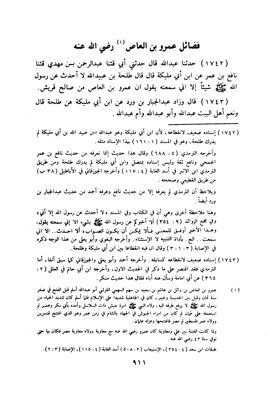 1742 - حَدَّثَنَا عَبْدُ اللَّهِ قَالَ: حَدَّثَنِي أَبِي، قثنا عَبْدُ الرَّحْمَنِ بْنُ مَهْدِيٍّ، قثنا نَافِعُ بْنُ عُمَرَ، عَنِ ابْنِ أَبِي مُلَيْكَةَ، قَالَ: قَالَ طَلْحَةُ بْنُ عُبَيْدِ اللَّهِ: لَا أُحَدِّثُ عَنْ رَسُولِ اللَّهِ صَلَّى اللهُ عَلَيْهِ وَسَلَّمَ شَيْئًا، إِلَّا أَنِّي سَمِعْتُهُ يَقُولُ: «§إِنَّ عَمْرَو بْنَ الْعَاصِ مِنْ صَالِحِ قُرَيْشٍ»