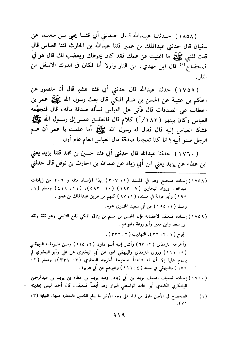 1758 - حَدَّثَنَا عَبْدُ اللَّهِ قَالَ: حَدَّثَنِي أَبِي، قثنا يَحْيَى بْنُ سَعِيدٍ، عَنْ سُفْيَانَ قَالَ: حَدَّثَنِي عَبْدُ الْمَلِكِ بْنُ عُمَيْرٍ قثنا عَبْدُ اللَّهِ بْنُ الْحَارِثِ قثنا الْعَبَّاسُ قَالَ: قُلْتُ لِلنَّبِيِّ صَلَّى اللهُ عَلَيْهِ وَسَلَّمَ: مَا أَغْنَيْتَ عَنْ عَمِّكَ فَقَدْ كَانَ يَحُوطُكَ، وَيَغْضَبُ لَكَ، قَالَ: «§هُوَ فِي ضَحْضَاحٍ» ، - قَالَ: ابْنُ مَهْدِيٍّ - «مِنَ النَّارِ وَلَوْلَا أَنَا لَكَانَ فِي الدَّرْكِ الْأَسْفَلِ مِنَ النَّارِ» .