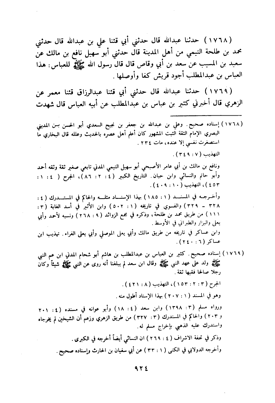 1768 - حَدَّثَنَا عَبْدُ اللَّهِ قَالَ: حَدَّثَنِي أَبِي، قثنا عَلِيُّ بْنُ عَبْدِ اللَّهِ قَالَ: حَدَّثَنِي مُحَمَّدُ بْنُ طَلْحَةَ التَّيْمِيُّ، مِنْ أَهْلِ الْمَدِينَةِ قَالَ: حَدَّثَنِي أَبُو سُهَيْلٍ نَافِعُ بْنُ مَالِكٍ، عَنْ سَعِيدِ بْنِ الْمُسَيِّبِ، عَنْ سَعْدِ بْنِ أَبِي وَقَّاصٍ قَالَ: قَالَ رَسُولُ اللَّهِ صَلَّى اللهُ عَلَيْهِ وَسَلَّمَ لِلْعَبَّاسِ: «§هَذَا الْعَبَّاسُ بْنُ عَبْدِ الْمُطَّلِبِ أَجْوَدُ قُرَيْشٍ كَفًّا وَأَوْصَلُهَا» .