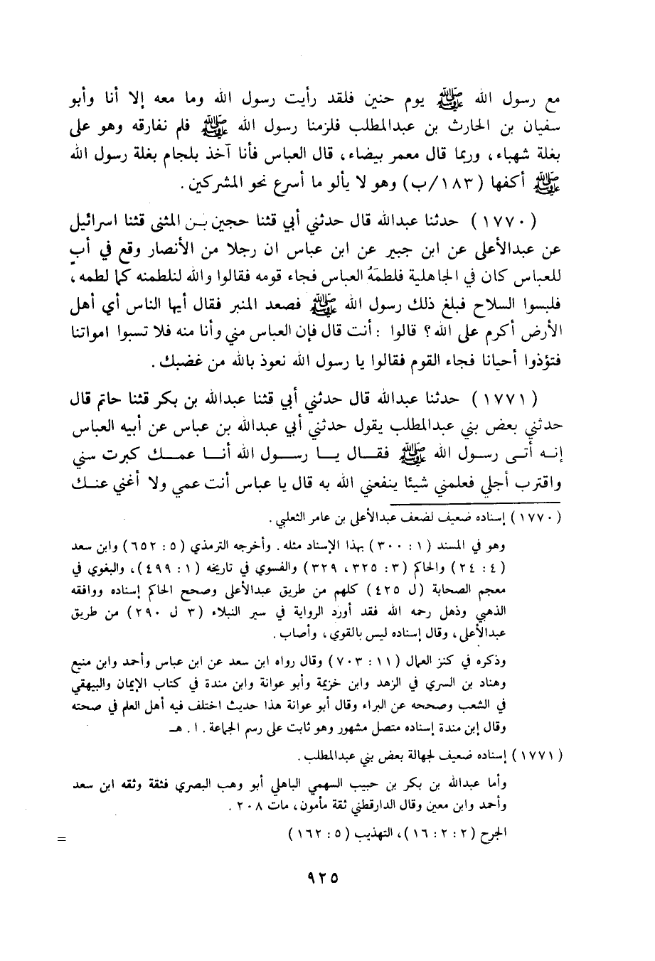 1770 - حَدَّثَنَا عَبْدُ اللَّهِ قَالَ: حَدَّثَنِي أَبِي، قثنا حُجَيْنُ بْنُ الْمُثَنَّى قثنا إِسْرَائِيلُ، عَنْ عَبْدِ الْأَعْلَى، عَنِ ابْنِ جُبَيْرٍ، عَنِ ابْنِ عَبَّاسٍ، أَنَّ رَجُلًا مِنَ الْأَنْصَارِ وَقَعَ فِي أَبٍ لِلْعَبَّاسِ كَانَ فِي الْجَاهِلِيَّةِ فَلَطَمَهُ الْعَبَّاسُ فَجَاءَ قَوْمُهُ، فَقَالُوا: وَاللَّهِ لَنَلْطِمَنَّهُ كَمَا لَطَمَهُ، فَلَبِسُوا السِّلَاحَ، فَبَلَغَ ذَلِكَ رَسُولَ اللَّهِ صَلَّى اللهُ عَلَيْهِ وَسَلَّمَ فَصَعَدَ الْمِنْبَرَ فَقَالَ: «أَيُّهَا النَّاسُ أَيُّ أَهْلِ الْأَرْضِ أَكْرَمُ عَلَى اللَّهِ؟» قَالُوا: أَنْتَ، قَالَ: «§فَإِنَّ الْعَبَّاسَ مِنِّي وَأَنَا مِنْهُ، فَلَا تَسُبُّوا أَمْوَاتَنَا، فَتُؤْذُوا أَحْيَاءَنَا» فَجَاءَ الْقَوْمُ فَقَالُوا: يَا رَسُولَ اللَّهِ، نَعُوذُ بِاللَّهِ مِنْ غَضَبِكَ.