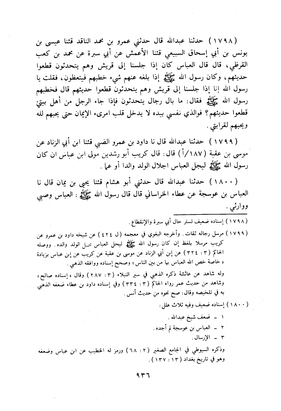1798 - حَدَّثَنَا عَبْدُ اللَّهِ قَالَ: حَدَّثَنِي عَمْرُو بْنُ مُحَمَّدٍ النَّاقِدُ قثنا عِيسَى بْنُ يُونُسَ بْنِ أَبِي إِسْحَاقَ السَّبِيعِيُّ قثنا الْأَعْمَشُ، عَنْ أَبِي سَبْرَةَ، عَنْ مُحَمَّدِ بْنِ كَعْبٍ الْقُرَظِيِّ قَالَ: قَالَ الْعَبَّاسُ: كَانَ إِذَا جَلَسْنَا إِلَى قُرَيْشٍ وَهُمْ يَتَحَدَّثُونَ قَطَعُوا حَدِيثَهُمْ، وَكَانَ رَسُولُ اللَّهِ صَلَّى اللهُ عَلَيْهِ وَسَلَّمَ إِذَا بَلَغَهُ عَنْهُمْ شَيْءٌ خَطَبَهُمْ فَيَتَّعِظُونَ، فَقُلْتُ: يَا رَسُولَ اللَّهِ، إِنَّا إِذَا جَلَسْنَا إِلَى قُرَيْشٍ وَهُمْ يَتَحَدَّثُونَ قَطَعُوا حَدِيثَهُمْ قَالَ: فَخَطَبَهُمْ رَسُولُ اللَّهِ صَلَّى اللهُ عَلَيْهِ وَسَلَّمَ فَقَالَ: «§مَا بَالُ رِجَالٍ يَتَحَدَّثُونَ، فَإِذَا جَاءَ الرَّجُلُ مِنْ أَهْلِ بَيْتِي، قَطَعُوا حَدِيثَهُمْ؟ فَوَالَّذِي نَفْسِي بِيَدِهِ، لَا يَدْخُلُ قَلْبَ امْرِئٍ الْإِيمَانُ حَتَّى يُحِبَّهُمْ لِلَّهِ وَيُحِبَّهُمْ لِقَرَابَتِي» .