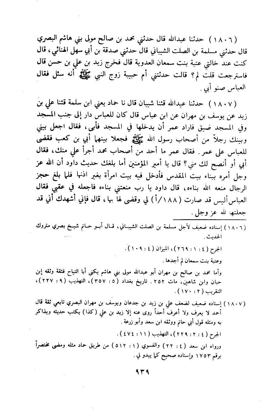 1806 - حَدَّثَنَا عَبْدُ اللَّهِ قَالَ: حَدَّثَنِي مُحَمَّدُ بْنُ صَالِحٍ مَوْلَى بَنِي هَاشِمٍ الْبَصْرِيُّ قَالَ: حَدَّثَنِي مَسْلَمَةُ بْنُ الصَّلْتِ الشَّيْبَانِيُّ قَالَ: حَدَّثَنِي صَدَقَةُ بْنُ أَبِي سَهْلٍ الْهُنَائِيُّ قَالَ: كُنْتُ عِنْدَ خَالَتِي عُتْبَةَ بِنْتِ سَمْعَانَ الْعَدَوِيَّةِ قَالَ: فَخَرَجَ زَيْدُ بْنُ عَلِيِّ بْنِ حَسَنٍ قَالَ: فَاسْتَرْجَعَتْ، قُلْتُ: لِمَ؟ قَالَتْ: حَدَّثَتْنِي أُمُّ حَبِيبَةَ زَوْجُ النَّبِيِّ صَلَّى اللهُ عَلَيْهِ وَسَلَّمَ أَنَّهُ سُئِلَ فَقَالَ: «§الْعَبَّاسُ صِنْوُ أَبِي» .