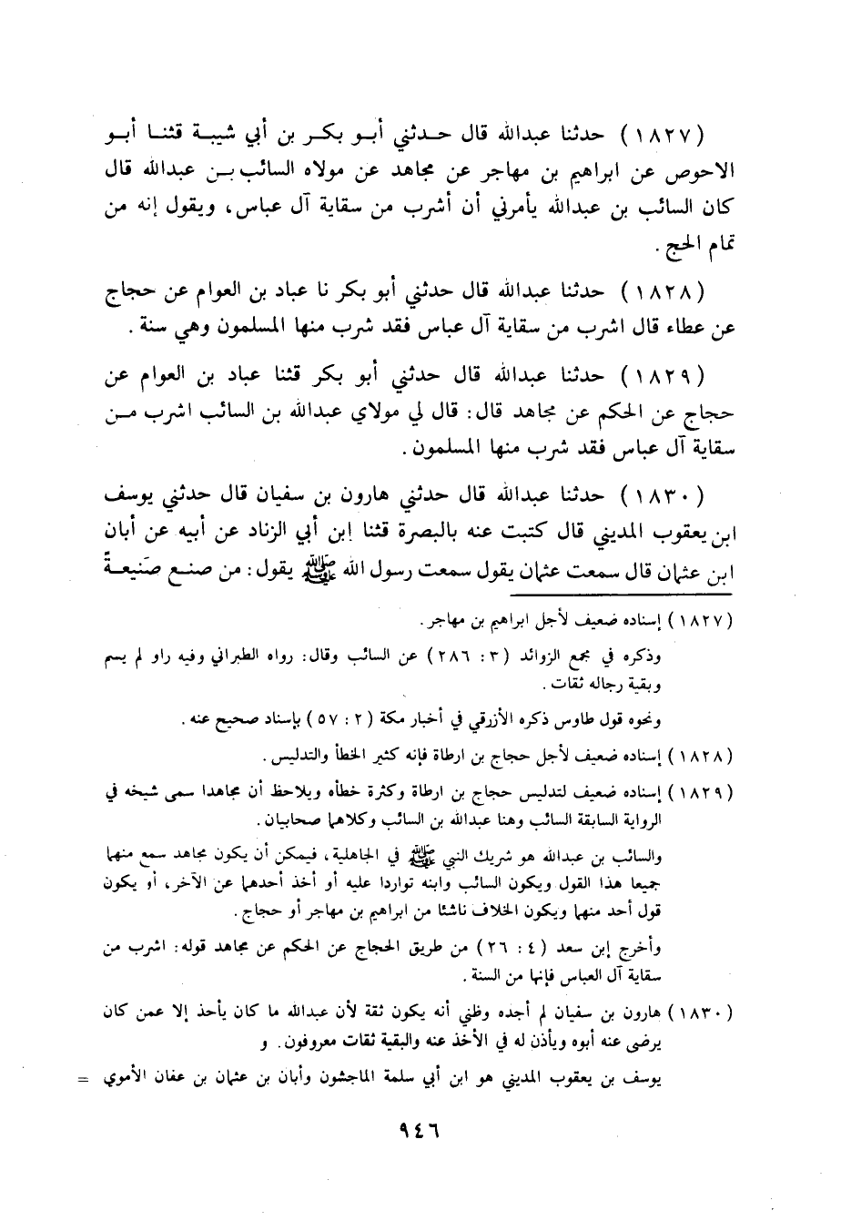 1827 - حَدَّثَنَا عَبْدُ اللَّهِ قَالَ: حَدَّثَنِي أَبُو بَكْرِ بْنُ أَبِي شَيْبَةَ قثنا أَبُو الْأَحْوَصِ، عَنْ إِبْرَاهِيمَ بْنِ مُهَاجِرٍ، عَنْ مُجَاهِدٍ، عَنْ مَوْلَاهُ السَّائِبِ بْنِ عَبْدِ اللَّهِ قَالَ: " §كَانَ السَّائِبُ بْنُ عَبْدِ اللَّهِ يَأْمُرُنِي أَنْ أَشْرَبَ مِنْ سِقَايَةِ آلِ عَبَّاسٍ، وَيَقُولُ: إِنَّهُ مِنْ تَمَامِ الْحَجِّ ".