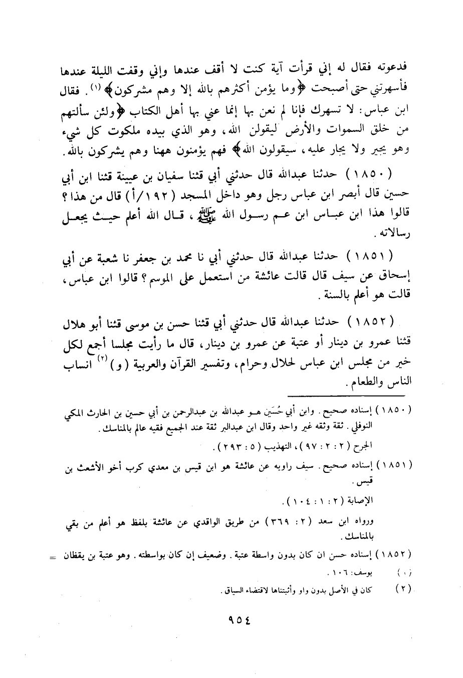 1850 - حَدَّثَنَا عَبْدُ اللَّهِ قَالَ: حَدَّثَنِي أَبِي، قثنا سُفْيَانُ بْنُ عُيَيْنَةَ قثنا ابْنُ أَبِي حُسَيْنٍ قَالَ: أَبْصَرَ ابْنَ عَبَّاسٍ رَجُلٌ وَهُوَ دَاخِلٌ الْمَسْجِدَ قَالَ: مَنْ هَذَا؟ قَالُوا: هَذَا ابْنُ عَبَّاسٍ ابْنُ عَمِّ رَسُولِ اللَّهِ صَلَّى اللهُ عَلَيْهِ وَسَلَّمَ قَالَ: §اللَّهُ أَعْلَمُ حَيْثُ يَجْعَلُ رِسَالَاتِهِ