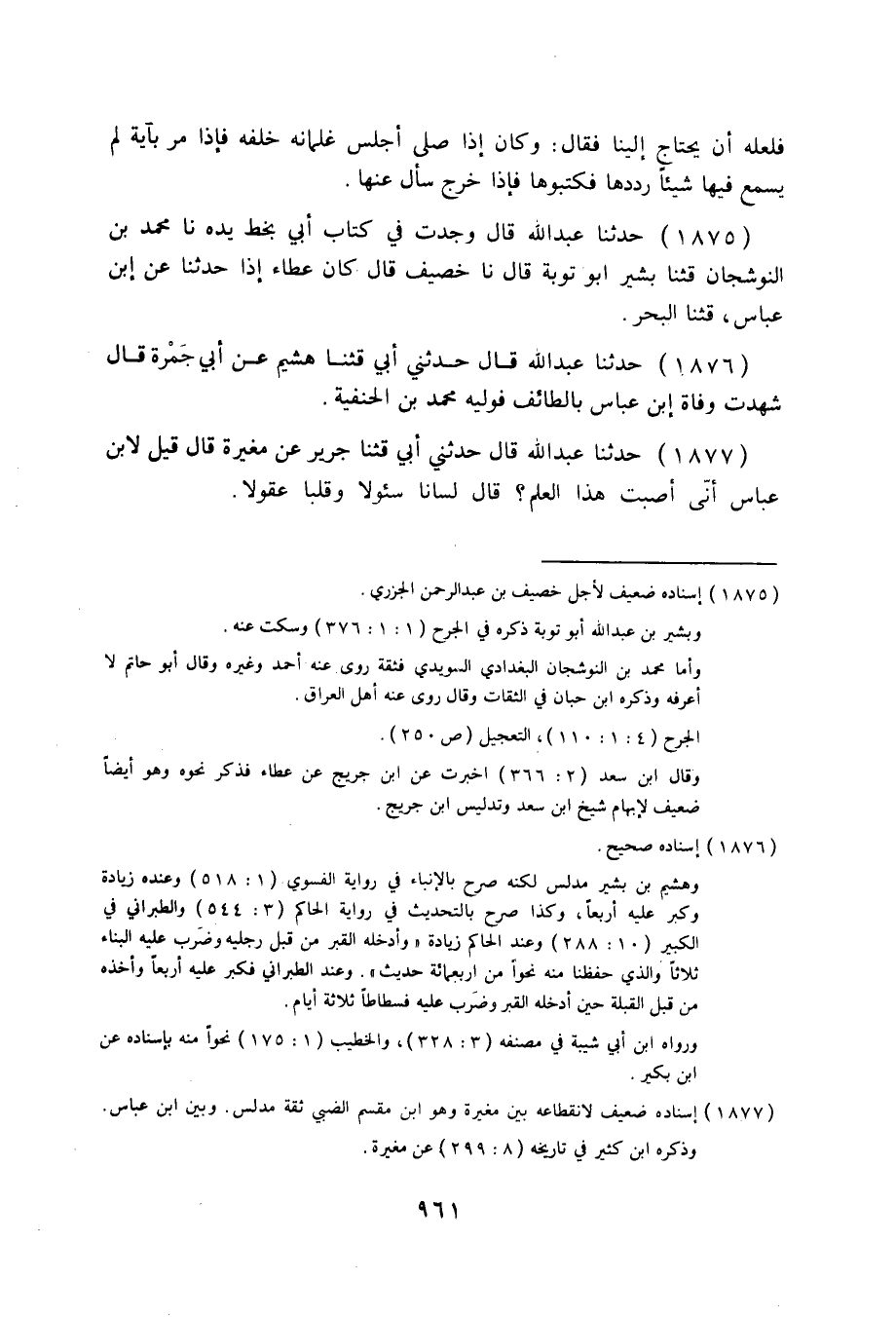 1875 - حَدَّثَنَا عَبْدُ اللَّهِ قَالَ: وَجَدْتُ فِي كِتَابِ أَبِي بِخَطِّ يَدِهِ، نا مُحَمَّدُ بْنُ النُّوشَجَانِ قثنا بَشِيرٌ أَبُو تَوْبَةَ قَالَ نا خُصَيْفٌ قَالَ: كَانَ عَطَاءٌ §إِذَا حَدَّثَنَا عَنِ ابْنِ عَبَّاسٍ قَالَ: «قثنا الْبَحْرُ»