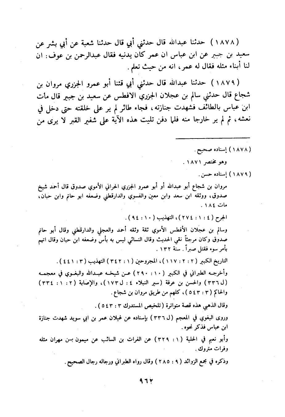 1879 - حَدَّثَنَا عَبْدُ اللَّهِ قَالَ: حَدَّثَنِي أَبِي، قثنا أَبُوعَمْرٍو الْجَزَرِيُّ مَرْوَانُ بْنُ شُجَاعٍ قَالَ: حَدَّثَنِي سَالِمُ بْنُ عَجْلَانَ الْجَزَرِيُّ الْأَفْطَسُ، عَنْ سَعِيدِ بْنِ جُبَيْرٍ قَالَ: " مَاتَ ابْنُ عَبَّاسٍ بِالطَّائِفِ فَشَهِدْتُ جَنَازَتَهُ، فَجَاءَ طَائِرٌ لَمْ يُرَ عَلَى خِلْقَتِهِ حَتَّى دَخَلَ فِي نَعْشِهِ، ثُمَّ لَمْ يُرَ خَارِجًا مِنْهُ فَلَمَّا دُفِنَ تُلِيَتْ هَذِهِ الْآيَةُ عَلَى شَفِيرِ الْقَبْرِ، لَا يُرَى مَنْ تَلَاهَا {§يَا أَيَّتُهَا النَّفْسُ الْمُطْمَئِنَّةُ ارْجِعِي إِلَى رَبِّكِ رَاضِيَةً مَرْضِيَّةً فَادْخُلِي فِي عِبَادِي وَادْخُلِي جَنَّتِي} [الفجر: 28] ". قَالَ مَرْوَانُ: وَأَمَّا إِسْمَاعِيلُ بْنُ عَلِيٍّ، وَعِيسَى بْنُ عَلِيٍّ، فَقَالَا: هُوَ طَائِرٌ أَبْيَضُ.