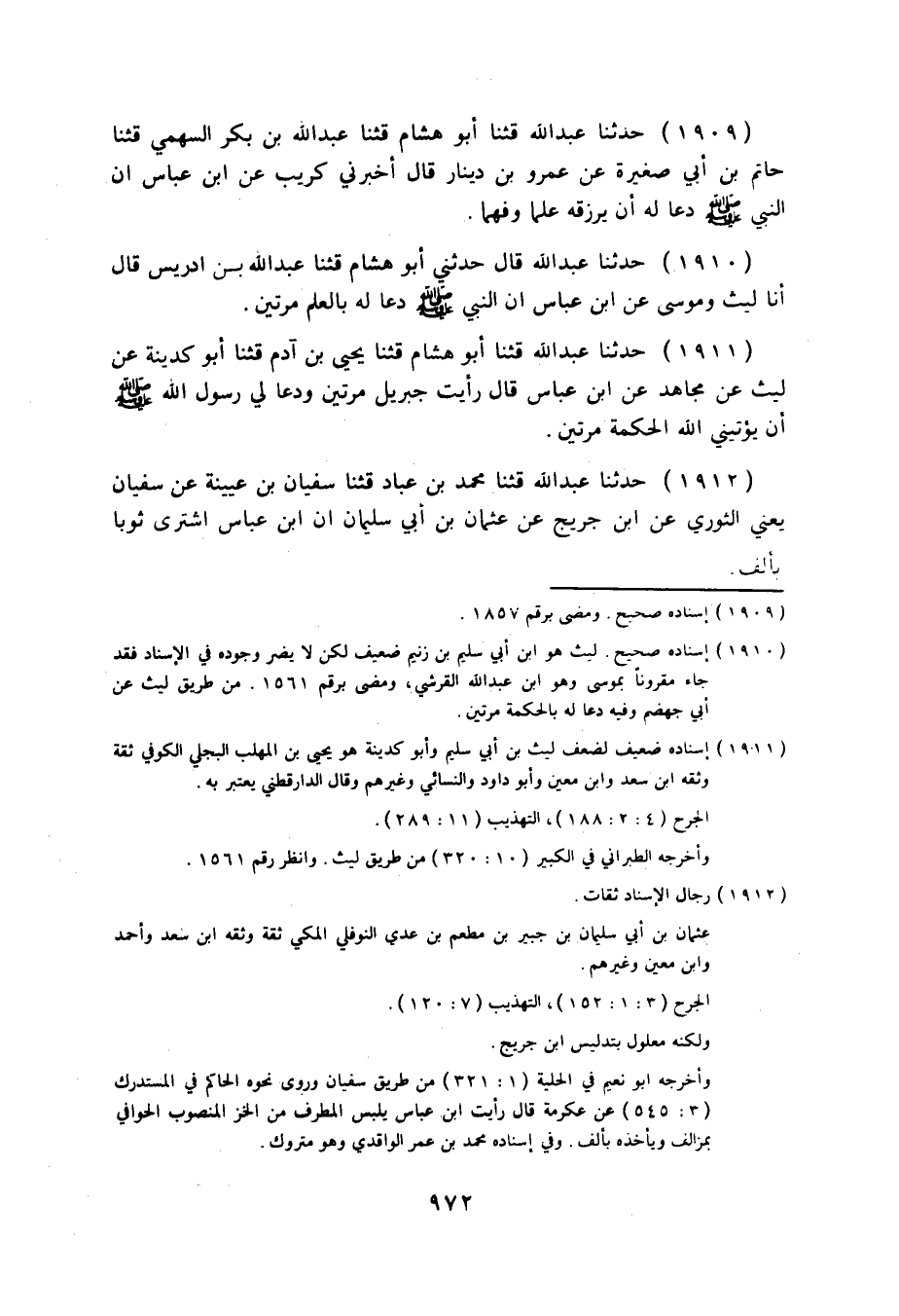 1910 - حَدَّثَنَا عَبْدُ اللَّهِ قَالَ: حَدَّثَنِي أَبُو هِشَامٍ قثنا عَبْدُ اللَّهِ بْنُ إِدْرِيسَ قَالَ: أنا لَيْثٌ، وَمُوسَى، عَنِ ابْنِ عَبَّاسٍ أَنَّ النَّبِيَّ صَلَّى اللهُ عَلَيْهِ وَسَلَّمَ «§دَعَا لَهُ بِالْعِلْمِ مَرَّتَيْنِ» .