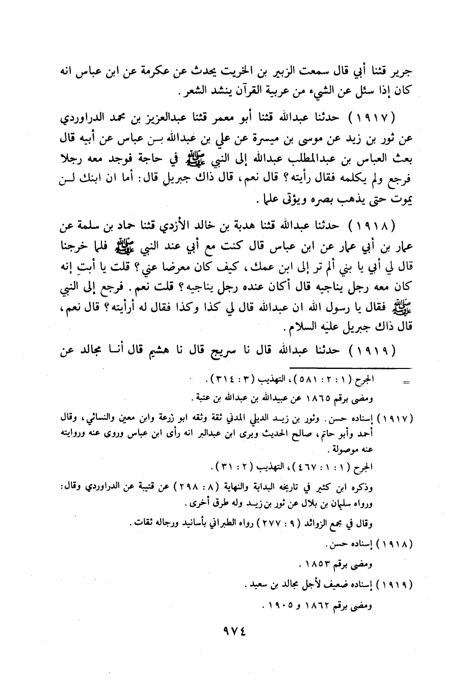 1918 - حَدَّثَنَا عَبْدُ اللَّهِ: قثنا هُدْبَةُ بْنُ خَالِدٍ الْأَزْدِيُّ قثنا حَمَّادُ بْنُ سَلَمَةَ، عَنْ عَمَّارِ بْنِ أَبِي عَمَّارٍ، عَنِ ابْنِ عَبَّاسٍ قَالَ: كُنْتُ مَعَ أَبِي عِنْدَ النَّبِيِّ صَلَّى اللهُ عَلَيْهِ وَسَلَّمَ فَلَمَّا خَرَجْنَا قَالَ لِي أَبِي: يَا بُنَيَّ؛ أَلَمْ تَرَ إِلَى ابْنِ عَمِّكَ كَيْفَ كَانَ مُعْرِضًا عَنِّي؟ قُلْتُ: يَا أَبَتِ إِنَّهُ كَانَ مَعَهُ رَجُلٌ يُنَاجِيهِ قَالَ: أَكَانَ عِنْدَهُ رَجُلٌ يُنَاجِيهِ؟ قُلْتُ: نَعَمْ، فَرَجَعَ إِلَى النَّبِيِّ صَلَّى اللهُ عَلَيْهِ وَسَلَّمَ فَقَالَ: يَا رَسُولَ اللَّهِ، إِنَّ عَبْدَ اللَّهِ قَالَ لِي: كَذَا وَكَذَا، فَقَالَ لَهُ: «§أَرَأَيْتَهُ؟» قَالَ: نَعَمْ، قَالَ: «ذَاكَ جِبْرِيلُ عَلَيْهِ السَّلَامُ» .