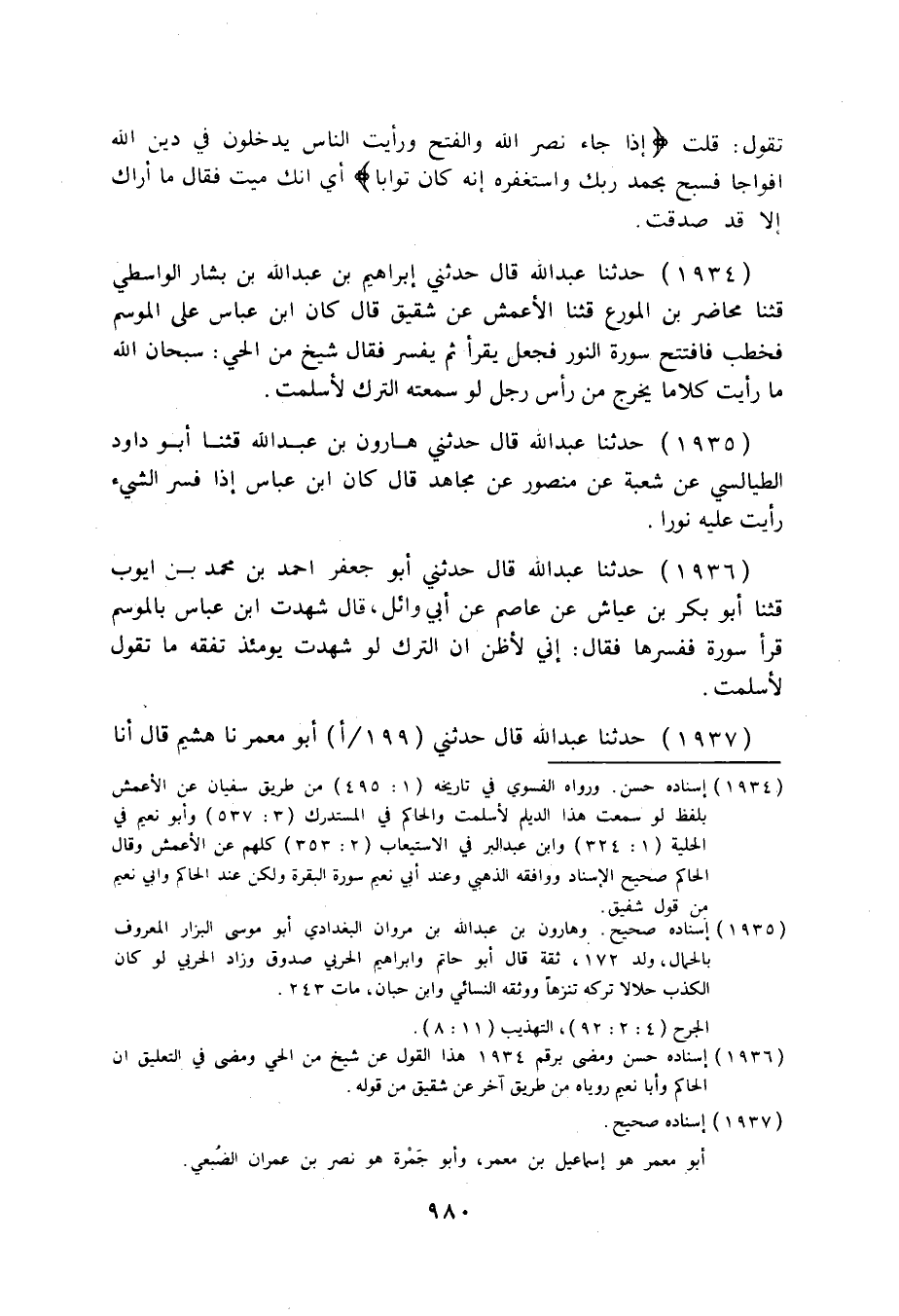 1934 - حَدَّثَنَا عَبْدُ اللَّهِ قَالَ: حَدَّثَنِي إِبْرَاهِيمُ بْنُ عَبْدِ اللَّهِ بْنِ بَشَّارٍ الْوَاسِطِيُّ قثنا مُحَاضِرُ بْنُ الْمُوَرِّعِ قثنا الْأَعْمَشُ، عَنْ شَقِيقٍ قَالَ: " كَانَ ابْنُ عَبَّاسٍ عَلَى الْمَوْسِمِ فَخَطَبَ فَافْتَتَحَ سُورَةَ النُّورِ، فَجَعَلَ يَقْرَأُ، ثُمَّ يُفَسِّرُ، فَقَالَ شَيْخٌ مِنَ الْحَيِّ: سُبْحَانَ اللَّهِ §مَا رَأَيْتُ كَلَامًا يَخْرُجُ مِنْ رَأْسِ رَجُلٍ لَوْ سَمِعَتْهُ التُّرْكُ لَأَسْلَمَتْ ".