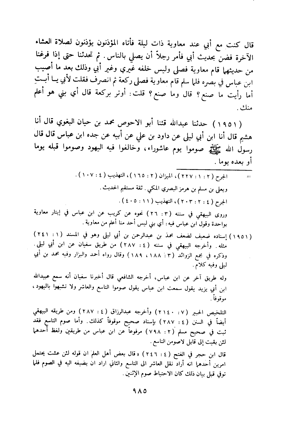 1951 - حَدَّثَنَا عَبْدُ اللَّهِ: قثنا أَبُو الْأَحْوَصِ مُحَمَّدُ بْنُ حَيَّانَ الْبَغَوِيُّ قَالَ: أنا هُشَيْمٌ قَالَ: أنا ابْنُ أَبِي لَيْلَى، عَنْ دَاوُدَ بْنِ عَلِيٍّ، عَنْ أَبِيهِ، عَنْ جَدِّهِ ابْنِ عَبَّاسٍ قَالَ: قَالَ رَسُولُ اللَّهِ صَلَّى اللهُ عَلَيْهِ وَسَلَّمَ: «§صُومُوا يَوْمَ عَاشُورَاءَ، وَخَالِفُوا فِيهِ الْيَهُودَ، وَصُومُوا قَبْلَهُ يَوْمًا أَبُو بَعْدَهُ يَوْمًا»
