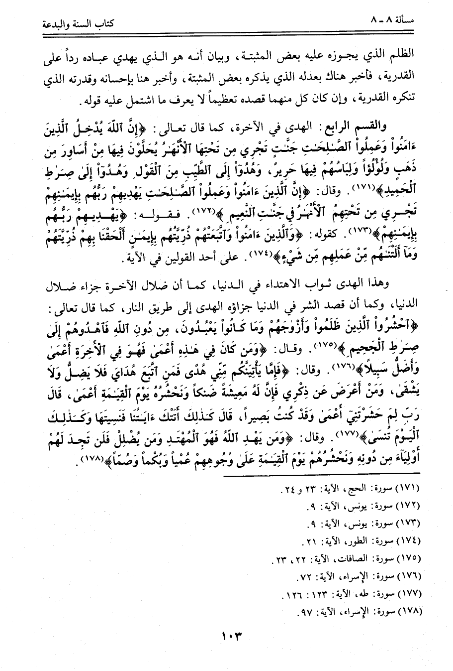 وَإِنْ كَانَ كُلٌّ مِنْهُمَا قَصْدُهُ تَعْظِيمًا لَا يَعْرِفُ مَا اشْتَمَلَ عَلَيْهِ قَوْلُهُ. وَالْقِسْمُ الرَّابِعُ: الْهُدَى فِي الْآخِرَةِ، كَمَا قَالَ تَعَالَى: {إِنَّ اللَّهَ يُدْخِلُ الَّذِينَ آمَنُوا وَعَمِلُوا الصَّالِحَاتِ جَنَّاتٍ تَجْرِي مِنْ تَحْتِهَا الأَنْهَارُ يُحَلَّوْنَ فِيهَا مِنْ أَسَاوِرَ مِنْ ذَهَبٍ وَلُؤْلُؤًا وَلِبَاسُهُمْ فِيهَا حَرِيرٌ} [الحج: 23] {وَهُدُوا إِلَى الطَّيِّبِ مِنَ الْقَوْلِ وَهُدُوا إِلَى صِرَاطِ الْحَمِيدِ} [الحج: 24] . وَقَالَ: {إِنَّ الَّذِينَ آمَنُوا وَعَمِلُوا الصَّالِحَاتِ يَهْدِيهِمْ رَبُّهُمْ بِإِيمَانِهِمْ تَجْرِي مِنْ تَحْتِهِمُ الأَنْهَارُ فِي جَنَّاتِ النَّعِيمِ} [يونس: 9] . فَقَوْلُهُ: {يَهْدِيهِمْ رَبُّهُمْ بِإِيمَانِهِمْ} [يونس: 9] . كَقَوْلِهِ: {وَالَّذِينَ آمَنُوا وَاتَّبَعَتْهُمْ ذُرِّيَّتُهُمْ بِإِيمَانٍ أَلْحَقْنَا بِهِمْ ذُرِّيَّتَهُمْ وَمَا أَلَتْنَاهُمْ مِنْ عَمَلِهِمْ مِنْ شَيْءٍ} [الطور: 21] . عَلَى أَحَدِ الْقَوْلَيْنِ فِي الْآيَةِ.