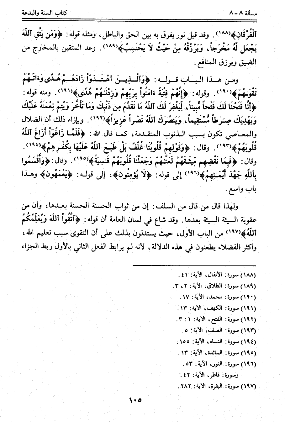 وَلِهَذَا قَالَ مَنْ قَالَ مِنْ السَّلَفِ: إنَّ مِنْ ثَوَابِ الْحَسَنَةِ الْحَسَنَةَ بَعْدَهَا، وَإِنَّ مِنْ عُقُوبَةِ السَّيِّئَةِ السَّيِّئَةَ بَعْدَهَا. وَقَدْ شَاعَ فِي لِسَانِ الْعَامَّةِ أَنَّ قَوْلَهُ: {وَاتَّقُوا اللَّهَ وَيُعَلِّمُكُمُ اللَّهُ} [البقرة: 282] مِنْ الْبَابِ الْأَوَّلِ، حَيْثُ يَسْتَدِلُّونَ بِذَلِكَ عَلَى أَنَّ التَّقْوَى سَبَبُ تَعْلِيمِ اللَّهِ، وَأَكْثَرُ الْفُضَلَاءِ يَطْعَنُونَ فِي هَذِهِ الدَّلَالَةِ؛ لِأَنَّهُ لَمْ يَرْبِطْ الْفِعْلَ الثَّانِيَ بِالْأَوَّلِ رَبْطَ الْجَزَاءِ