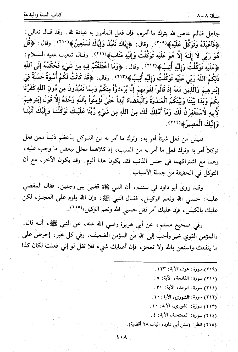 وَقَالَ: {وَمَا اخْتَلَفْتُمْ فِيهِ مِنْ شَيْءٍ فَحُكْمُهُ إِلَى اللَّهِ ذَلِكُمُ اللَّهُ رَبِّي عَلَيْهِ تَوَكَّلْتُ وَإِلَيْهِ أُنِيبُ} [الشورى: 10] . وَقَالَ: {قَدْ كَانَتْ لَكُمْ أُسْوَةٌ حَسَنَةٌ فِي إِبْرَاهِيمَ وَالَّذِينَ مَعَهُ إِذْ قَالُوا لِقَوْمِهِمْ إِنَّا بُرَآءُ مِنْكُمْ وَمِمَّا تَعْبُدُونَ مِنْ دُونِ اللَّهِ كَفَرْنَا بِكُمْ وَبَدَا بَيْنَنَا وَبَيْنَكُمُ الْعَدَاوَةُ وَالْبَغْضَاءُ أَبَدًا حَتَّى تُؤْمِنُوا بِاللَّهِ وَحْدَهُ إِلا قَوْلَ إِبْرَاهِيمَ لأَبِيهِ لأَسْتَغْفِرَنَّ لَكَ وَمَا أَمْلِكُ لَكَ مِنَ اللَّهِ مِنْ شَيْءٍ رَبَّنَا عَلَيْكَ تَوَكَّلْنَا وَإِلَيْكَ أَنَبْنَا وَإِلَيْكَ الْمَصِيرُ} [الممتحنة: 4] . فَلَيْسَ مَنْ فَعَلَ شَيْئًا أُمِرَ بِهِ، وَتَرَكَ مَا أُمِرَ بِهِ مِنْ التَّوَكُّلِ بِأَعْظَمَ ذَنْبًا مِمَّنْ فَعَلَ تَوَكُّلًا أُمِرَ بِهِ وَتَرَكَ فِعْلَ مَا أُمِرَ بِهِ مِنْ السَّبَبِ، إذْ كِلَاهُمَا مُخِلٌّ بِبَعْضِ مَا وَجَبَ عَلَيْهِ، وَهُمَا مَعَ اشْتِرَاكِهِمَا فِي جِنْسِ الذَّنْبِ فَقَدْ يَكُونُ هَذَا أَلْوَمَ. وَقَدْ يَكُونُ الْآخَرُ، مَعَ أَنَّ التَّوَكُّلَ فِي الْحَقِيقَةِ مِنْ جُمْلَةِ الْأَسْبَابِ.