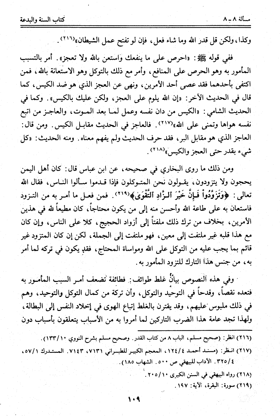 وَكَمَا فِي الْحَدِيثِ الشَّامِيِّ: «الْكَيِّسُ مَنْ دَانَ نَفْسَهُ وَعَمِلَ لِمَا بَعْدَ الْمَوْتِ، وَالْعَاجِزُ مَنْ أَتْبَعَ نَفْسَهُ هَوَاهَا وَتَمَنَّى عَلَى اللَّهِ» . فَالْعَاجِزُ فِي الْحَدِيثِ مُقَابِلُ الْكَيِّسِ، وَمَنْ قَالَ: الْعَاجِزُ الَّذِي هُوَ مُقَابِلُ الْبَرِّ، فَقَدْ حَرَّفَ الْحَدِيثَ وَلَمْ يَفْهَمْ مَعْنَاهُ. وَمِنْهُ الْحَدِيثُ: «كُلُّ شَيْءٍ بِقَدَرٍ حَتَّى الْعَجْزُ وَالْكَيْسُ» . وَمِنْ ذَلِكَ مَا رَوَى الْبُخَارِيُّ فِي صَحِيحِهِ، عَنْ ابْنِ عَبَّاسٍ قَالَ: كَانَ أَهْلُ الْيَمَنِ يَحُجُّونَ وَلَا يَتَزَوَّدُونَ، يَقُولُونَ نَحْنُ الْمُتَوَكِّلُونَ فَإِذَا قَدِمُوا سَأَلُوا النَّاسَ، فَقَالَ اللَّهُ تَعَالَى: {وَتَزَوَّدُوا فَإِنَّ خَيْرَ الزَّادِ التَّقْوَى} [البقرة: 197] . فَمَنْ فَعَلَ مَا أُمِرَ بِهِ مِنْ التَّزَوُّدِ فَاسْتَعَانَ بِهِ عَلَى طَاعَةِ اللَّهِ وَأَحْسَنَ مِنْهُ إلَى مَنْ يَكُونُ مُحْتَاجًا، كَانَ مُطِيعًا لِلَّهِ فِي هَذَيْنِ الْأَمْرَيْنِ، بِخِلَافِ مَنْ تَرَكَ ذَلِكَ مُلْتَفِتًا إلَى أَزْوَادِ الْحَجِيجِ كَلًّا عَلَى النَّاسِ، وَإِنْ كَانَ مَعَ هَذَا قَلْبُهُ غَيْرُ مُلْتَفِتٍ إلَى مُعِينٍ، فَهُوَ مُلْتَفِتٌ إلَى الْجُمْلَةِ، لَكِنْ إنْ كَانَ الْمُتَزَوِّدُ غَيْرَ قَائِمٍ بِمَا يَجِبُ عَلَيْهِ مِنْ التَّوَكُّلِ عَلَى اللَّهِ وَمُوَاسَاةِ الْمُحْتَاجِ، فَقَدْ يَكُونُ فِي تَرْكِهِ لِمَا أُمِرَ بِهِ، مِنْ جِنْسِ هَذَا التَّارِكِ لِلتَّزَوُّدِ الْمَأْمُورِ بِهِ.