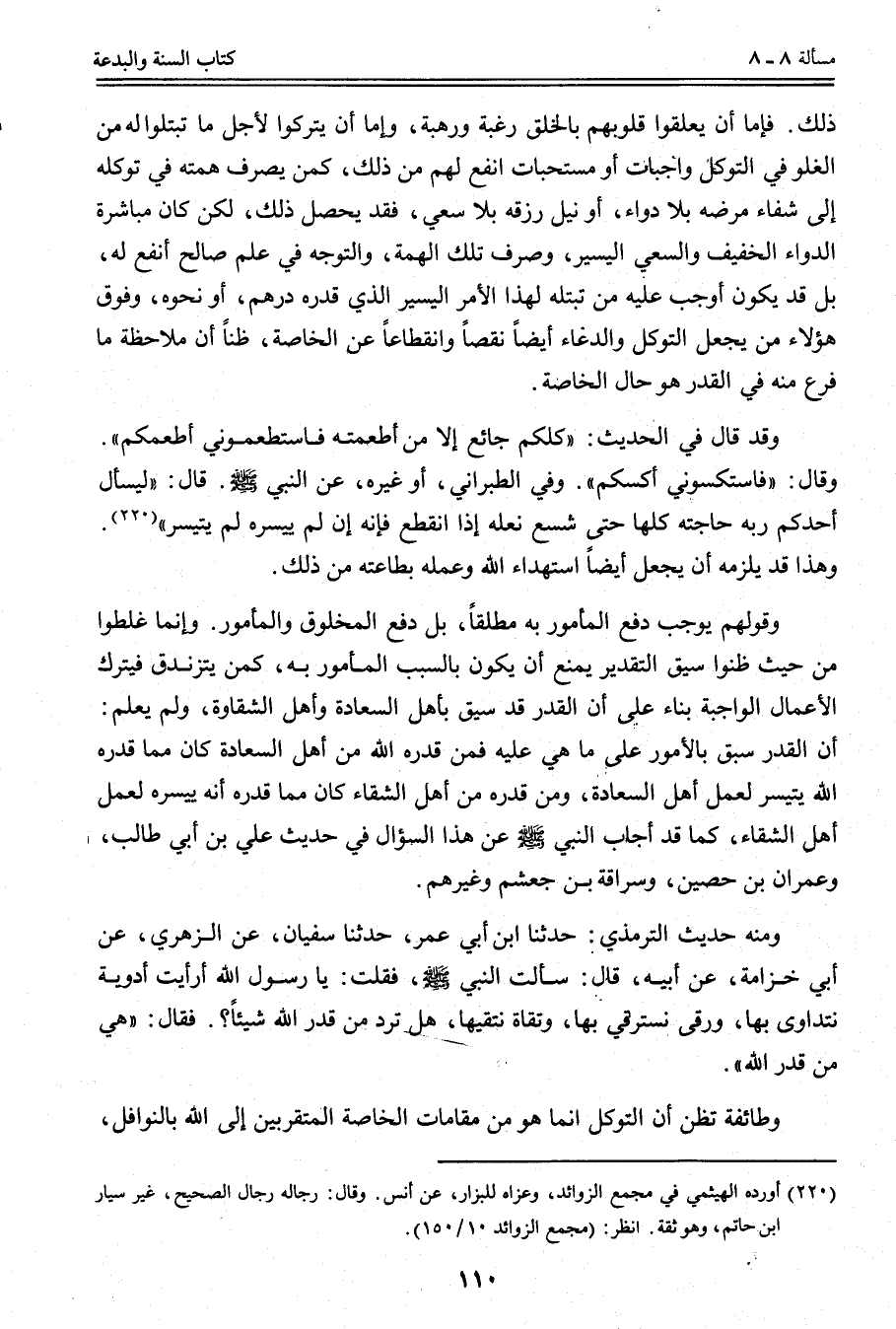وَمِنْهُ حَدِيثُ التِّرْمِذِيِّ حَدَّثَنَا ابْنُ أَبِي عُمَرَ، حَدَّثَنَا سُفْيَانُ، عَنْ الزُّهْرِيِّ، عَنْ أَبِي خُزَامَةَ، عَنْ أَبِيهِ، «قَالَ: سَأَلْت النَّبِيَّ - صَلَّى اللَّهُ عَلَيْهِ وَسَلَّمَ - فَقُلْت: يَا رَسُولَ اللَّهِ أَرَأَيْتَ أَدْوِيَةً نَتَدَاوَى بِهَا، وَرُقًى نَسْتَرْقِي بِهَا، وَتُقَاةً نَتَّقِيهَا، تَرُدُّ مِنْ قَدَرِ اللَّهِ شَيْئًا؟ . فَقَالَ: هِيَ مِنْ قَدَرِ اللَّهِ» . وَطَائِفَةٌ تَظُنُّ أَنَّ التَّوَكُّلَ إنَّمَا هُوَ مِنْ مَقَامَاتِ الْخَاصَّةِ الْمُتَقَرِّبِينَ إلَى اللَّهِ بِالنَّوَافِلِ،