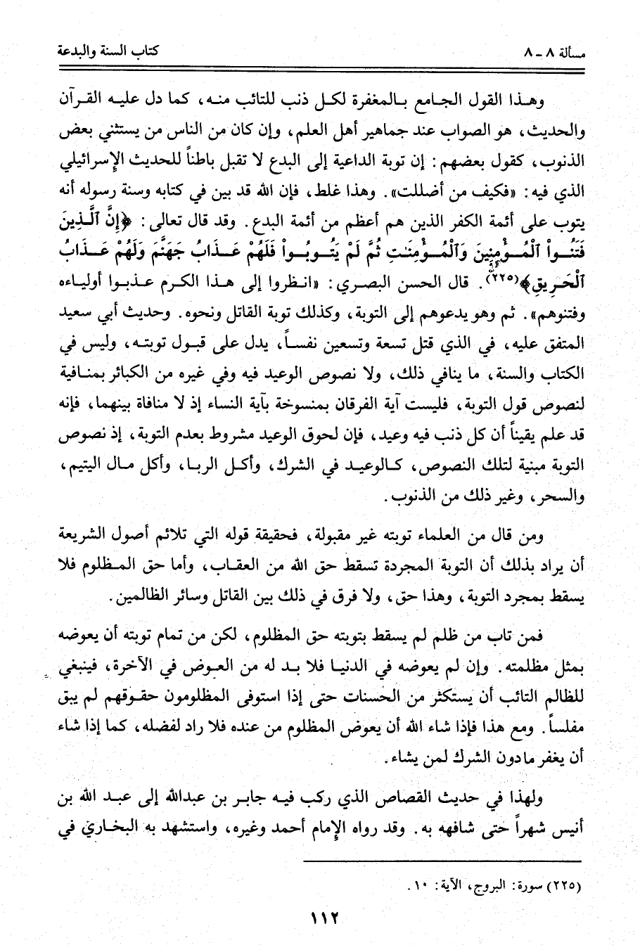 وَهَذَا الْقَوْلُ الْجَامِعُ بِالْمَغْفِرَةِ لِكُلِّ ذَنْبٍ لِلتَّائِبِ مِنْهُ، كَمَا دَلَّ عَلَيْهِ الْقُرْآنُ وَالْحَدِيثُ، هُوَ الصَّوَابُ عِنْدَ جَمَاهِيرِ أَهْلِ الْعِلْمِ، وَإِنْ كَانَ مِنْ النَّاسِ مَنْ يَسْتَثْنِي بَعْضَ الذُّنُوبِ، كَقَوْلِ بَعْضِهِمْ: إنَّ تَوْبَةَ الدَّاعِيَةِ إلَى الْبِدَعِ لَا تُقْبَلُ بَاطِنًا لِلْحَدِيثِ الْإِسْرَائِيلِيِّ الَّذِي فِيهِ: " فَكَيْفَ مَنْ أَضْلَلْت "، وَهَذَا غَلَطٌ، فَإِنَّ اللَّهَ قَدْ بَيَّنَ فِي كِتَابِهِ وَسُنَّةِ رَسُولِهِ أَنَّهُ يَتُوبُ عَلَى أَئِمَّةِ الْكُفْرِ الَّذِينَ هُمْ أَعْظَمُ مِنْ أَئِمَّةِ الْبِدَعِ، وَقَدْ قَالَ تَعَالَى: {إِنَّ الَّذِينَ فَتَنُوا الْمُؤْمِنِينَ وَالْمُؤْمِنَاتِ ثُمَّ لَمْ يَتُوبُوا فَلَهُمْ عَذَابُ جَهَنَّمَ وَلَهُمْ عَذَابُ الْحَرِيقِ} [البروج: 10] . قَالَ الْحَسَنُ الْبَصْرِيُّ: " اُنْظُرُوا إلَى هَذَا الْكَرَمِ عَذَّبُوا أَوْلِيَاءَهُ وَفَتَنُوهُمْ ثُمَّ وَهُوَ يَدْعُوهُمْ إلَى التَّوْبَةِ " وَكَذَلِكَ تَوْبَةُ الْقَاتِلِ وَنَحْوِهِ. وَحَدِيثُ أَبِي سَعِيدٍ الْمُتَّفَقُ عَلَيْهِ، فِي الَّذِي قَتَلَ تِسْعَةً وَتِسْعِينَ نَفْسًا، يَدُلُّ عَلَى قَبُولِ تَوْبَتِهِ، وَلَيْسَ فِي الْكِتَابِ وَالسُّنَّةِ، مَا يُنَافِي ذَلِكَ، وَلَا نُصُوصُ الْوَعِيدِ فِيهِ وَفِي غَيْرِهِ مِنْ الْكَبَائِرِ بِمُنَافِيَةٍ لِنُصُوصِ قَوْلِ التَّوْبَةِ، فَلَيْسَتْ آيَةُ الْفُرْقَانِ بِمَنْسُوخَةٍ بِآيَةِ النِّسَاءِ إذْ لَا مُنَافَاةَ بَيْنَهُمَا، فَإِنَّهُ قَدْ عُلِمَ يَقِينًا أَنَّ كُلَّ ذَنْبٍ فِيهِ وَعِيدٌ، فَإِنَّ لُحُوقَ الْوَعِيدِ مَشْرُوطٌ بِعَدَمِ التَّوْبَةِ، إذْ نُصُوصُ التَّوْبَةِ مُبَيِّنَةٌ لِتِلْكَ النُّصُوصِ، كَالْوَعِيدِ فِي الشِّرْكِ، وَأَكْلِ الرِّبَا وَأَكْلِ مَالِ الْيَتِيمِ وَالسِّحْرِ، وَغَيْرِ ذَلِكَ مِنْ الذُّنُوبِ.