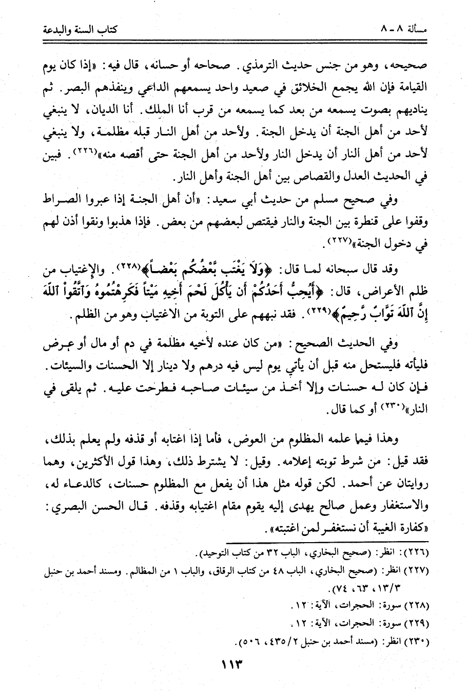 وَفِي صَحِيحِ مُسْلِمٍ مِنْ حَدِيثِ أَبِي سَعِيدٍ: «أَنَّ أَهْلَ الْجَنَّةِ إذَا عَبَرُوا الصِّرَاطَ وَقَفُوا عَلَى قَنْطَرَةٍ بَيْنَ الْجَنَّةِ وَالنَّارِ فَيُقْتَصُّ لِبَعْضِهِمْ مِنْ بَعْضٍ. فَإِذَا هُذِّبُوا وَنَقَوْا أُذِنَ لَهُمْ فِي دُخُولِ الْجَنَّةِ» . وَقَدْ قَالَ سُبْحَانَهُ لَمَّا قَالَ: {وَلا يَغْتَبْ بَعْضُكُمْ بَعْضًا} [الحجرات: 12] ، وَالِاغْتِيَابُ مِنْ ظُلْمِ الْأَعْرَاضِ، قَالَ: {أَيُحِبُّ أَحَدُكُمْ أَنْ يَأْكُلَ لَحْمَ أَخِيهِ مَيْتًا فَكَرِهْتُمُوهُ وَاتَّقُوا اللَّهَ إِنَّ اللَّهَ تَوَّابٌ رَحِيمٌ} [الحجرات: 12] .