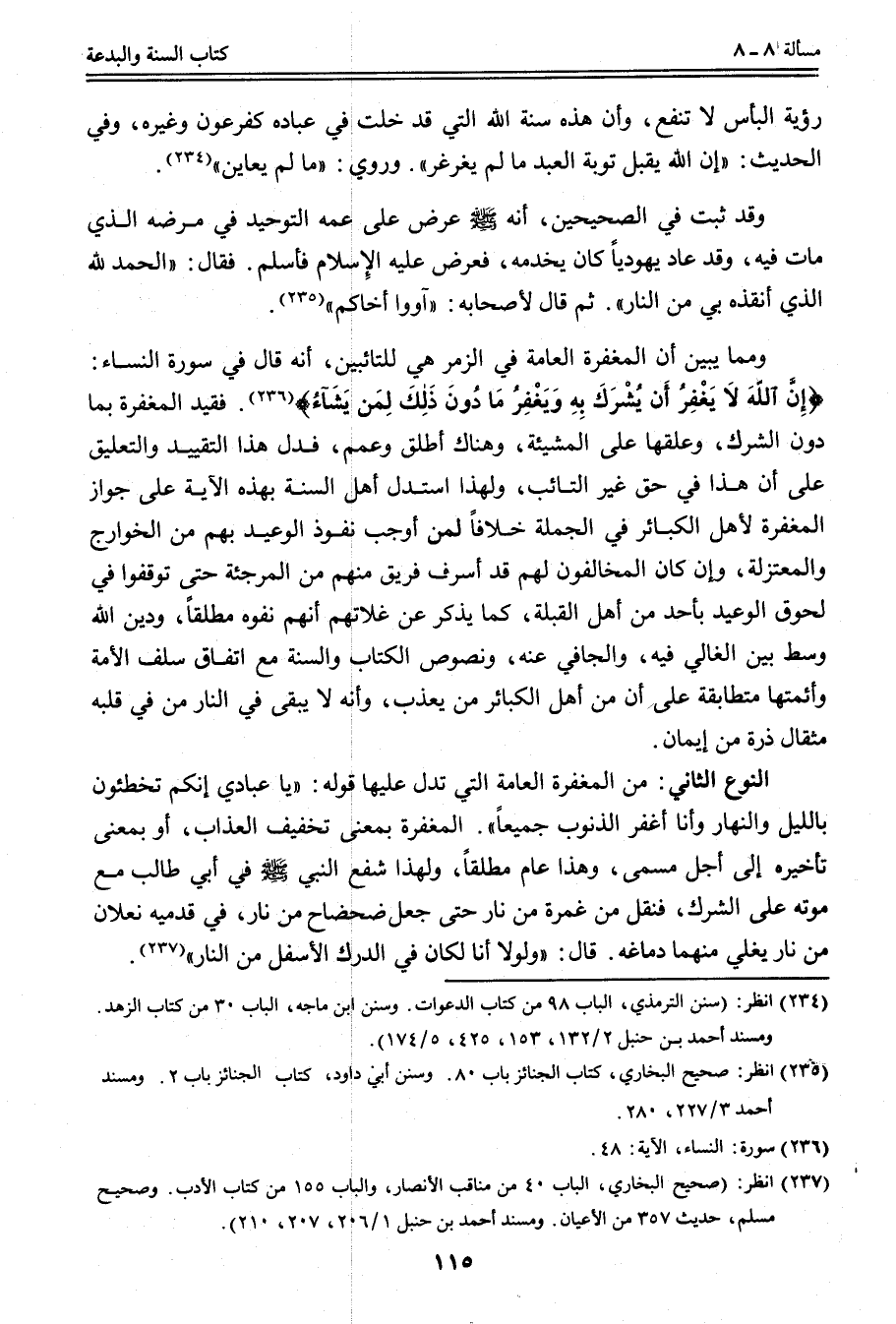 وَمِمَّا يُبَيِّنُ أَنَّ الْمَغْفِرَةَ الْعَامَّةَ فِي الزُّمَرِ هِيَ لِلتَّائِبِينَ، أَنَّهُ قَالَ فِي سُورَةِ النِّسَاءِ: {إِنَّ اللَّهَ لا يَغْفِرُ أَنْ يُشْرَكَ بِهِ وَيَغْفِرُ مَا دُونَ ذَلِكَ لِمَنْ يَشَاءُ} [النساء: 48] . فَقَيَّدَ الْمَغْفِرَةَ بِمَا دُونَ الشِّرْكِ، وَعَلَّقَهَا عَلَى الْمَشِيئَةِ، وَهُنَاكَ أَطْلَقَ وَعَمَّمَ، فَدَلَّ هَذَا التَّقْيِيدُ وَالتَّعْلِيقُ عَلَى أَنَّ هَذَا فِي حَقِّ غَيْرِ التَّائِبِ، وَلِهَذَا اسْتَدَلَّ أَهْلُ السُّنَّةِ بِهَذِهِ الْآيَةِ عَلَى جَوَازِ الْمَغْفِرَةِ لِأَهْلِ الْكَبَائِرِ فِي الْجُمْلَةِ خِلَافًا لِمَنْ أَوْجَبَ نُفُوذَ الْوَعِيدِ بِهِمْ مِنْ الْخَوَارِجِ وَالْمُعْتَزِلَةِ، وَإِنْ كَانَ الْمُخَالِفُونَ لَهُمْ قَدْ أَسْرَفَ فَرِيقٌ مِنْهُمْ مِنْ الْمُرْجِئَةِ حَتَّى تَوَقَّفُوا فِي لُحُوقِ الْوَعِيدِ بِأَحَدٍ مِنْ أَهْلِ الْقِبْلَةِ، كَمَا يُذْكَرُ عَنْ غُلَاتِهِمْ أَنَّهُمْ نَفَوْهُ مُطْلَقًا، وَدِينُ اللَّهِ وَسَطٌ بَيْنَ الْغَالِي فِيهِ، وَالْجَافِي عَنْهُ، نُصُوصُ الْكِتَابِ وَالسُّنَّةِ مَعَ اتِّفَاقِ سَلَفِ الْأُمَّةِ وَأَئِمَّتِهَا مُتَطَابِقَةٌ عَلَى أَنَّ مِنْ أَهْلِ الْكَبَائِرِ مَنْ يُعَذَّبُ، وَأَنَّهُ لَا يَبْقَى فِي النَّارِ مَنْ فِي قَلْبِهِ مِثْقَالُ ذَرَّةٍ مِنْ إيمَانٍ.