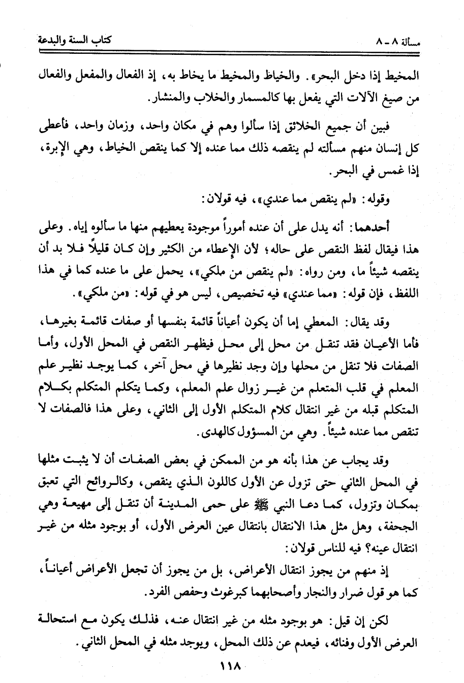وَقَدْ يُقَالُ: الْمُعْطَى إمَّا أَنْ يَكُونَ أَعْيَانًا قَائِمَةً بِنَفْسِهَا أَوْ صِفَاتٍ قَائِمَةً بِغَيْرِهَا، فَأَمَّا الْأَعْيَانُ فَقَدْ تُنْقَلُ مِنْ مَحَلٍّ إلَى مَحَلٍّ فَيَظْهَرُ النَّقْصُ فِي الْمَحَلِّ الْأَوَّلِ، وَأَمَّا الصِّفَاتُ فَلَا تُنْقَلُ مِنْ مَحَلِّهَا وَإِنْ وُجِدَ نَظِيرُهَا فِي مَحَلٍّ آخَرَ، كَمَا يُوجَدُ نَظِيرُ عِلْمِ الْمُعَلِّمِ فِي قَلْبِ الْمُتَعَلِّمِ مِنْ غَيْرِ زَوَالِ عِلْمِ الْمُعَلِّمِ، وَكَمَا يَتَكَلَّمُ الْمُتَكَلِّمُ بِكَلَامِ الْمُتَكَلِّمِ قَبْلَهُ مِنْ غَيْرِ انْتِقَالِ كَلَامِ الْمُتَكَلِّمِ الْأَوَّلِ إلَى الثَّانِي، وَعَلَى هَذَا فَالصِّفَاتُ لَا تَنْقُصُ مِمَّا عِنْدَهُ شَيْئًا، وَهِيَ مِنْ الْمَسْئُولِ كَالْهُدَى. وَقَدْ يُجَابُ عَنْ هَذَا بِأَنَّهُ هُوَ مِنْ الْمُمْكِنِ فِي بَعْضِ الصِّفَاتِ أَنْ لَا يَثْبُتَ مِثْلُهَا فِي الْمَحَلِّ الثَّانِي حَتَّى تَزُولَ عَنْ الْأَوَّلِ كَاللَّوْنِ الَّذِي يَنْقُصُ، وَكَالرَّوَائِحِ الَّتِي تَعْبَقُ بِمَكَانٍ وَتَزُولُ، كَمَا دَعَا النَّبِيُّ - صَلَّى اللَّهُ عَلَيْهِ وَسَلَّمَ - عَلَى حُمَّى الْمَدِينَةِ أَنْ تُنْقَلَ إلَى مَهْيَعَةٍ وَهِيَ الْجُحْفَةُ، وَهَلْ مِثْلُ هَذَا الِانْتِقَالِ بِانْتِقَالِ عَيْنِ الْعَرَضِ الْأَوَّلِ، أَوْ بِوُجُودِ مِثْلِهِ مِنْ غَيْرِ انْتِقَالِ عَيْنِهِ؟ فِيهِ لِلنَّاسِ قَوْلَانِ: إذْ مِنْهُمْ مَنْ يُجَوِّزُ انْتِقَالَ الْأَعْرَاضِ، بَلْ مَنْ يُجَوِّزُ أَنْ تُجْعَلَ الْأَعْرَاضُ أَعْيَانًا، كَمَا هُوَ قَوْلُ ضِرَارٍ وَالنَّجَّارِ وَأَصْحَابِهِمَا كَبُرْغُوثٍ وَحَفْصِ الْفَرْدِ. لَكِنْ إنْ قِيلَ: هُوَ بِوُجُودِ مِثْلِهِ مِنْ غَيْرِ انْتِقَالٍ عَنْهُ، فَذَلِكَ يَكُونُ مَعَ اسْتِحَالَةِ الْعَرَضِ الْأَوَّلِ وَفَنَائِهِ، فَيُعْدَمُ عَنْ ذَلِكَ الْمَحَلِّ، وَيُوجَدُ مِثْلُهُ فِي الْمَحَلِّ الثَّانِي.