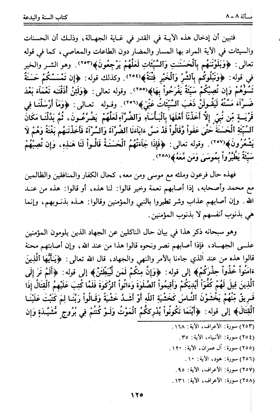 فَتَبَيَّنَ أَنَّ إدْخَالَ هَذِهِ الْآيَةِ فِي الْقَدَرِ فِي غَايَةِ الْجَهَالَةِ، وَذَلِكَ أَنَّ الْحَسَنَاتِ وَالسَّيِّئَاتِ فِي الْآيَةِ الْمُرَادُ بِهَا الْمَسَار وَالْمَضَارُّ دُونَ الطَّاعَاتِ وَالْمَعَاصِي، كَمَا فِي قَوْله تَعَالَى: {وَبَلَوْنَاهُمْ بِالْحَسَنَاتِ وَالسَّيِّئَاتِ لَعَلَّهُمْ يَرْجِعُونَ} [الأعراف: 168] . وَهُوَ الشَّرُّ وَالْخَيْرُ فِي قَوْلِهِ: {وَنَبْلُوكُمْ بِالشَّرِّ وَالْخَيْرِ فِتْنَةً} [الأنبياء: 35] ، وَكَذَلِكَ قَوْلُهُ: {إِنْ تَمْسَسْكُمْ حَسَنَةٌ تَسُؤْهُمْ وَإِنْ تُصِبْكُمْ سَيِّئَةٌ يَفْرَحُوا بِهَا} [آل عمران: 120] . وقَوْله تَعَالَى: {وَلَئِنْ أَذَقْنَاهُ نَعْمَاءَ بَعْدَ ضَرَّاءَ مَسَّتْهُ لَيَقُولَنَّ ذَهَبَ السَّيِّئَاتُ عَنِّي} [هود: 10] ، وقَوْله تَعَالَى: {وَمَا أَرْسَلْنَا فِي قَرْيَةٍ مِنْ نَبِيٍّ إِلا أَخَذْنَا أَهْلَهَا بِالْبَأْسَاءِ وَالضَّرَّاءِ لَعَلَّهُمْ يَضَّرَّعُونَ - ثُمَّ بَدَّلْنَا مَكَانَ السَّيِّئَةِ الْحَسَنَةَ حَتَّى عَفَوْا وَقَالُوا قَدْ مَسَّ آبَاءَنَا الضَّرَّاءُ وَالسَّرَّاءُ فَأَخَذْنَاهُمْ بَغْتَةً وَهُمْ لا يَشْعُرُونَ} [الأعراف: 94 - 95] .