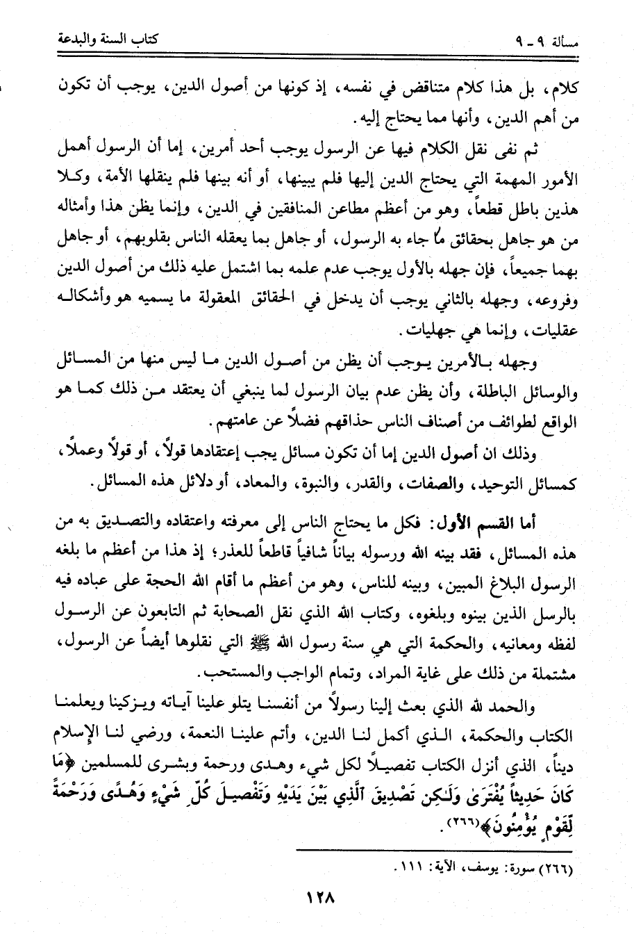أَمَّا الْقِسْمُ الْأَوَّلُ: فَكُلُّ مَا يَحْتَاجُ النَّاسُ إلَى مَعْرِفَتِهِ وَاعْتِقَادِهِ وَالتَّصْدِيقُ بِهِ مِنْ هَذِهِ الْمَسَائِلِ، فَقَدْ بَيَّنَهُ اللَّهُ وَرَسُولُهُ بَيَانًا شَافِيًا قَاطِعًا لِلْعُذْرِ؛ إذْ هَذَا مِنْ أَعْظَمِ مَا بَلَّغَهُ الرَّسُولُ الْبَلَاغَ الْمُبِينَ، وَبَيَّنَهُ لِلنَّاسِ، وَهُوَ مِنْ أَعْظَمِ مَا أَقَامَ اللَّهُ الْحُجَّةَ عَلَى عِبَادِهِ فِيهِ بِالرُّسُلِ الَّذِينَ بَيَّنُوهُ وَبَلَّغُوهُ، وَكِتَابُ اللَّهِ الَّذِي نَقَلَ الصَّحَابَةُ ثُمَّ التَّابِعُونَ عَنْ الرَّسُولِ لَفْظَهُ وَمَعَانِيَهُ، وَالْحِكْمَةُ الَّتِي هِيَ سُنَّةُ رَسُولِ اللَّهِ - صَلَّى اللَّهُ عَلَيْهِ وَسَلَّمَ - الَّتِي نَقَلُوهَا أَيْضًا عَنْ الرَّسُولِ، مُشْتَمِلَةٌ مِنْ ذَلِكَ عَلَى غَايَةِ الْمُرَادِ، وَتَمَامِ الْوَاجِبِ وَالْمُسْتَحَبِّ. وَالْحَمْدُ لِلَّهِ الَّذِي بَعَثَ إلَيْنَا رَسُولًا مِنْ أَنْفُسِنَا يَتْلُو عَلَيْنَا آيَاتِهِ وَيُزَكِّينَا وَيُعَلِّمُنَا الْكِتَابَ وَالْحِكْمَةَ، الَّذِي أَكْمَلَ لَنَا الدِّينَ، وَأَتَمَّ عَلَيْنَا النِّعْمَةَ، وَرَضِيَ لَنَا الْإِسْلَامَ دِينًا، الَّذِي أَنْزَلَ الْكِتَابَ تَفْصِيلًا لِكُلِّ شَيْءٍ وَهُدًى وَرَحْمَةٌ وَبُشْرَى لِلْمُسْلِمِينَ {مَا كَانَ حَدِيثًا يُفْتَرَى وَلَكِنْ تَصْدِيقَ الَّذِي بَيْنَ يَدَيْهِ وَتَفْصِيلَ كُلِّ شَيْءٍ وَهُدًى وَرَحْمَةً لِقَوْمٍ يُؤْمِنُونَ} [يوسف: 111] .