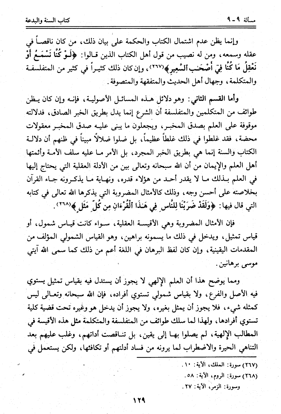 فَإِنَّ الْأَمْثَالَ الْمَضْرُوبَةَ وَهِيَ الْأَقْيِسَةُ الْعَقْلِيَّةُ، سَوَاءٌ كَانَتْ قِيَاسَ شُمُولٍ، أَوْ قِيَاسَ تَمْثِيلٍ، وَيَدْخُلُ فِي ذَلِكَ مَا يُسَمُّونَهُ بَرَاهِينَ، وَهُوَ الْقِيَاسُ الشُّمُولِيُّ الْمُؤَلَّفُ مِنْ الْمُقَدِّمَاتِ الْيَقِينِيَّةِ، وَإِنْ كَانَ لَفْظُ الْبُرْهَانِ فِي اللُّغَةِ أَعَمَّ مِنْ ذَلِكَ كَمَا سَمَّى اللَّهُ آيَتَيْ مُوسَى بُرْهَانَيْنِ. وَمِمَّا يُوَضِّحُ هَذَا أَنَّ الْعِلْمَ الْإِلَهِيَّ لَا يَجُوزُ أَنْ يُسْتَدَلَّ فِيهِ بِقِيَاسِ تَمْثِيلٍ يَسْتَوِي فِيهِ الْأَصْلُ وَالْفَرْعُ، وَلَا بِقِيَاسٍ شُمُولِيٍّ تَسْتَوِي أَفْرَادُهُ، فَإِنَّ اللَّهَ سُبْحَانَهُ وَتَعَالَى لَيْسَ كَمِثْلِهِ شَيْءٌ، فَلَا يَجُوزُ أَنْ يُمَثَّلَ بِغَيْرِهِ، وَلَا يَجُوزُ أَنْ يَدْخُلَ هُوَ وَغَيْرُهُ تَحْتَ قَضِيَّةٍ كُلِّيَّةٍ تَسْتَوِي أَفْرَادُهَا، وَلِهَذَا لَمَّا سَلَكَ طَوَائِفُ مِنْ الْمُتَفَلْسِفَةِ وَالْمُتَكَلِّمَةِ مِثْلَ هَذِهِ الْأَقْيِسَةِ فِي الْمَطَالِبِ الْإِلَهِيَّةِ، لَمْ يَصِلُوا بِهَا إلَى يَقِينٍ، بَلْ تَنَاقَصَتْ أَدَاتُهُمْ، وَغَلَبَ عَلَيْهِمْ بَعْدَ التَّنَاهِي الْحِيرَةُ وَالِاضْطِرَابُ لِمَا يَرَوْنَهُ مِنْ فَسَادِ أَدِلَّتِهِمْ أَوْ تَكَافُئِهَا، وَلَكِنْ يُسْتَعْمَلُ فِي