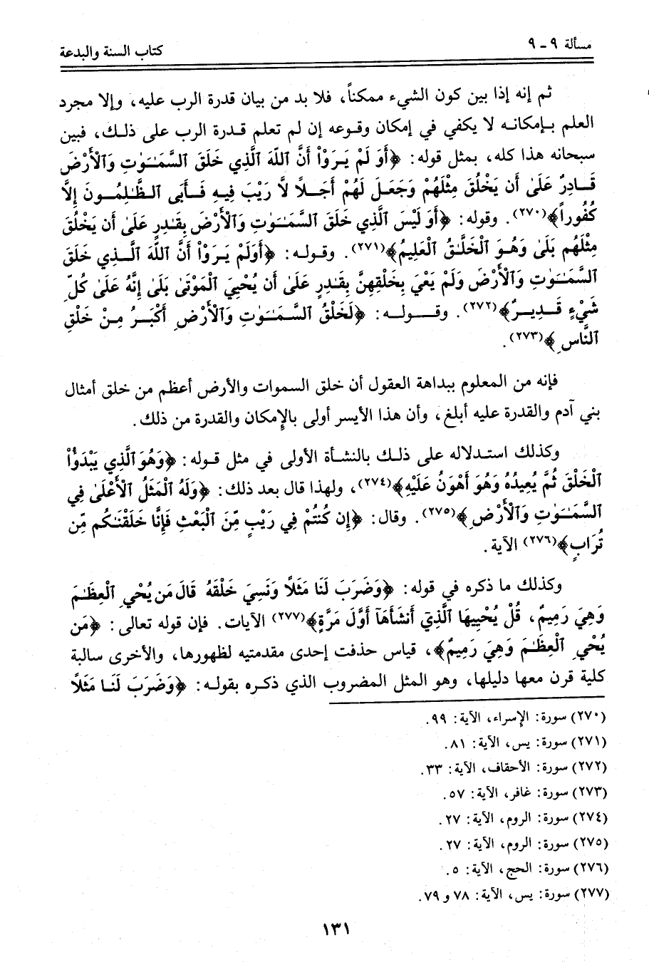 ثُمَّ إنَّهُ إذَا بَيَّنَ كَوْنَ الشَّيْءِ مُمْكِنًا، فَلَا بُدَّ مِنْ بَيَانِ قُدْرَةِ الرَّبِّ عَلَيْهِ، وَإِلَّا مُجَرَّدُ الْعِلْمِ بِإِمْكَانِهِ لَا يَكْفِي فِي إمْكَانِهِ وُقُوعُهُ إنْ لَمْ تُعْلَمْ قُدْرَةُ الرَّبِّ عَلَى ذَلِكَ، فَبَيَّنَ سُبْحَانَهُ هَذَا كُلَّهُ، بِمِثْلِ قَوْلِهِ: {أَوَلَمْ يَرَوْا أَنَّ اللَّهَ الَّذِي خَلَقَ السَّمَاوَاتِ وَالأَرْضَ قَادِرٌ عَلَى أَنْ يَخْلُقَ مِثْلَهُمْ وَجَعَلَ لَهُمْ أَجَلا لا رَيْبَ فِيهِ فَأَبَى الظَّالِمُونَ إِلا كُفُورًا} [الإسراء: 99] . وَقَوْلِهِ: {أَوَلَيْسَ الَّذِي خَلَقَ السَّمَاوَاتِ وَالأَرْضَ بِقَادِرٍ عَلَى أَنْ يَخْلُقَ مِثْلَهُمْ بَلَى وَهُوَ الْخَلاقُ الْعَلِيمُ} [يس: 81] .