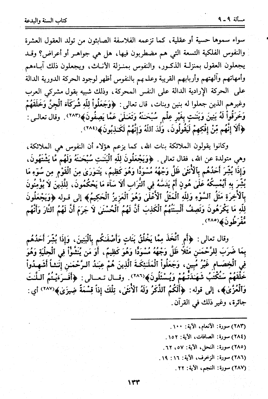 سَوَاءٌ سَمَّوْهَا حِسِّيَّةً أَوْ عَقْلِيَّةً، كَمَا تَزْعُمُهُ الْفَلَاسِفَةُ الصَّابِئُونَ مِنْ تَوَلُّدِ الْعُقُولِ الْعَشَرَةِ وَالنُّفُوسِ الْفَلَكِيَّةِ التِّسْعَةِ الَّتِي هُمْ مُضْطَرِبُونَ فِيهَا، هَلْ هِيَ جَوَاهِرُ أَوْ أَعْرَاضٌ؟ وَقَدْ يَجْعَلُونَ الْعُقُولَ بِمَنْزِلَةِ الذُّكُورِ، وَالنُّفُوسَ بِمَنْزِلَةِ الْإِنَاثِ، وَيَجْعَلُونَ ذَلِكَ آبَاءَهُمْ وَأُمَّهَاتِهِمْ وَآلِهَتَهُمْ وَأَرْبَابَهُمْ الْقَرِيبَةَ، وَعِلْمُهُمْ بِالنُّفُوسِ أَظْهَرُ لِوُجُودِ الْحَرَكَةِ الدَّوْرِيَّةِ الدَّالَّةِ عَلَى الْحَرَكَةِ الْإِرَادِيَّةِ الدَّالَّةِ عَلَى النَّفْسِ الْمُحَرِّكَةِ، وَذَلِكَ شَبِيهٌ بِقَوْلِ مُشْرِكِي الْعَرَبِ وَغَيْرِهِمْ الَّذِينَ جَعَلُوا لَهُ بَنِينَ وَبَنَاتٍ.