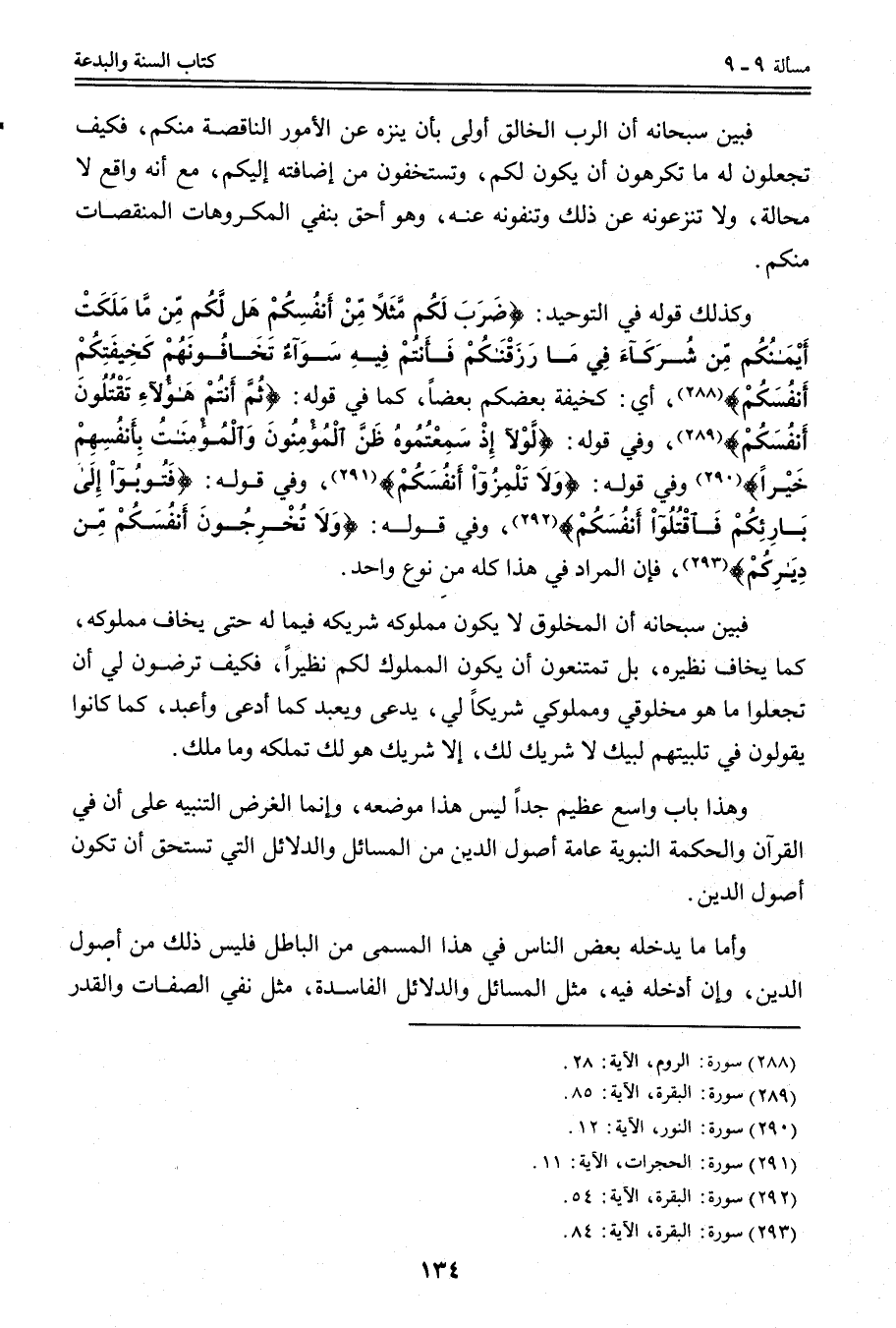 وَفِي قَوْلِهِ: {فَتُوبُوا إِلَى بَارِئِكُمْ فَاقْتُلُوا أَنْفُسَكُمْ} [البقرة: 54] ، وَفِي قَوْلِهِ: {وَلا تُخْرِجُونَ أَنْفُسَكُمْ مِنْ دِيَارِكُمْ} [البقرة: 84] ، فَإِنَّ الْمُرَادَ فِي هَذَا كُلِّهِ مِنْ نَوْعٍ وَاحِدٍ. فَبَيَّنَ سُبْحَانَهُ أَنَّ الْمَخْلُوقَ لَا يَكُونُ مَمْلُوكُهُ شَرِيكَهُ فِيمَا لَهُ حَتَّى يَخَافَ مَمْلُوكَهُ، كَمَا يَخَافُ نَظِيرَهُ، بَلْ تَمْتَنِعُونَ أَنْ يَكُونَ الْمَمْلُوكُ لَكُمْ نَظِيرًا، فَكَيْفَ تَرْضَوْنَ لِي أَنْ تَجْعَلُوا مَا هُوَ مَخْلُوقِي وَمَمْلُوكِي شَرِيكًا لِي، يُدْعَى وَيُعْبَدُ كَمَا أُدْعَى وَأُعْبَدُ، كَمَا كَانُوا يَقُولُونَ فِي تَلْبِيَتِهِمْ لَبَّيْكَ لَا شَرِيكَ لَك، إلَّا شَرِيكٌ هُوَ لَك تَمْلِكُهُ وَمَا مَلَكَ. وَهَذَا بَابٌ وَاسِعٌ عَظِيمٌ جِدًّا لَيْسَ هَذَا مَوْضِعَهُ، وَإِنَّمَا الْغَرَضُ التَّنْبِيهُ عَلَى أَنَّ فِي الْقُرْآنِ وَالْحِكْمَةِ النَّبَوِيَّةِ عَامَّةَ أُصُولِ الدِّينِ مِنْ الْمَسَائِلِ وَالدَّلَائِلِ الَّتِي تُسْتَحَقُّ أَنْ تَكُونَ أُصُولَ الدِّينِ.