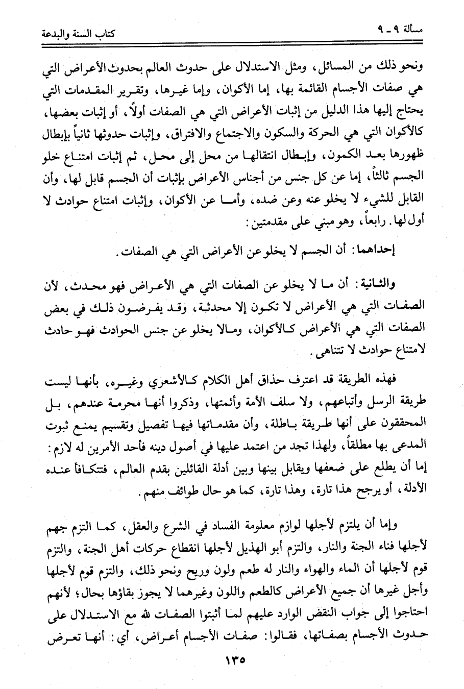 وَنَحْوِ ذَلِكَ مِنْ الْمَسَائِلِ، وَمِثْلُ الِاسْتِدْلَالِ عَلَى حُدُوثِ الْعَالَمِ بِحُدُوثِ الْأَعْرَاضِ الَّتِي هِيَ صِفَاتُ الْأَجْسَامِ الْقَائِمَةِ بِهَا، إمَّا الْأَكْوَانُ، وَإِمَّا غَيْرُهَا، وَتَقْرِيرُ الْمُقَدِّمَاتِ الَّتِي يَحْتَاجُ إلَيْهَا هَذَا الدَّلِيلُ مِنْ إثْبَاتِ الْأَعْرَاضِ الَّتِي هِيَ الصِّفَاتُ أَوَّلًا، أَوْ إثْبَاتُ بَعْضِهَا، كَالْأَكْوَانِ الَّتِي هِيَ الْحَرَكَةُ وَالسُّكُونُ وَالِاجْتِمَاعُ وَالِافْتِرَاقُ، وَإِثْبَاتُ حُدُوثِهَا ثَانِيًا بِإِبْطَالِ ظُهُورِهَا بَعْدَ الْكُمُونِ، وَإِبْطَالُ انْتِقَالِهَا مِنْ مَحَلٍّ إلَى مَحَلٍّ، ثُمَّ إثْبَاتُ امْتِنَاعِ خُلُوِّ الْجِسْمِ ثَالِثًا، إمَّا عَنْ كُلِّ جِنْسٍ مِنْ أَجْنَاسِ الْأَعْرَاضِ بِإِثْبَاتِ أَنَّ الْجِسْمَ قَابِلٌ لَهَا، وَأَنَّ الْقَابِلَ لِلشَّيْءِ لَا يَخْلُو عَنْهُ وَعَنْ ضِدِّهِ، وَإِمَّا عَنْ الْأَكْوَانِ، وَإِثْبَاتِ امْتِنَاعِ حَوَادِثَ لَا أَوَّلَ لَهَا.