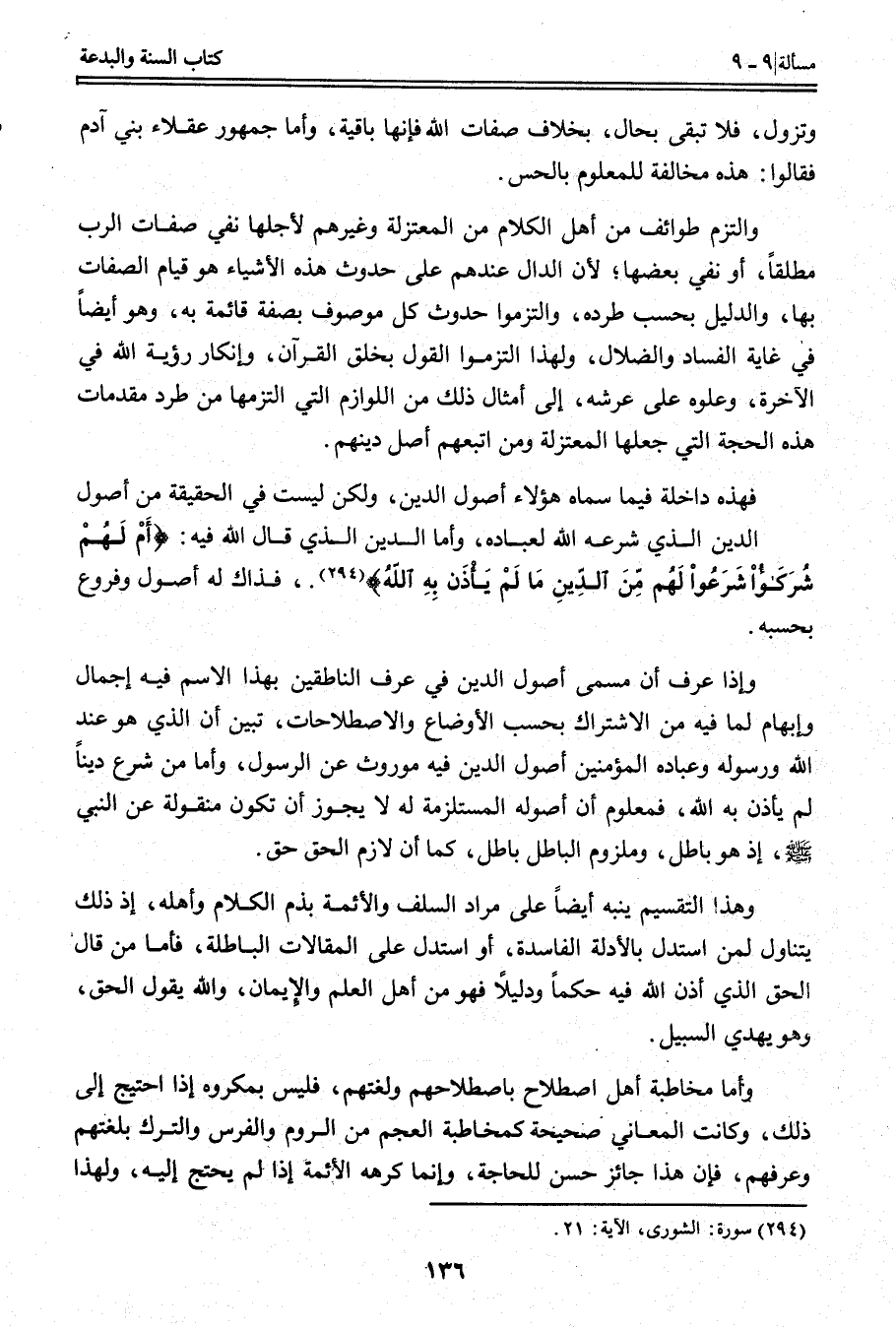 وَإِذَا عُرِفَ أَنَّ مُسَمَّى أُصُولِ الدِّينِ فِي عُرْفِ النَّاطِقِينَ بِهَذَا الِاسْمِ فِيهِ إجْمَالٌ وَإِبْهَامٌ لِمَا فِيهِ مِنْ الِاشْتِرَاكِ بِحَسَبِ الْأَوْضَاعِ وَالِاصْطِلَاحَاتِ، تَبَيَّنَ أَنَّ الَّذِي هُوَ عِنْدَ اللَّهِ وَرَسُولِهِ وَعِبَادِهِ الْمُؤْمِنِينَ أُصُولُ الدِّينِ فِيهِ مَوْرُوثٌ عَنْ الرَّسُولِ، وَأَمَّا مَنْ شَرَعَ دِينًا لَمْ يَأْذَنْ بِهِ اللَّهُ، فَمَعْلُومٌ أَنَّ أُصُولَهُ الْمُسْتَلْزِمَةَ لَهُ لَا يَجُوزُ أَنْ تَكُونَ مَنْقُولَةً عَنْ النَّبِيِّ - صَلَّى اللَّهُ عَلَيْهِ وَسَلَّمَ - إذْ هُوَ بَاطِلٌ، وَمَلْزُومُ الْبَاطِلِ بَاطِلٌ، كَمَا أَنَّ لَازِمَ الْحَقِّ حَقٌّ. وَهَذَا التَّقْسِيمُ يُنَبِّهُ أَيْضًا عَلَى مُرَادِ السَّلَفِ وَالْأَئِمَّةِ بِذَمِّ الْكَلَامِ وَأَهْلِهِ، إذْ ذَلِكَ يَتَنَاوَلُ لِمَنْ اسْتَدَلَّ بِالْأَدِلَّةِ الْفَاسِدَةِ، أَوْ اسْتَدَلَّ عَلَى الْمَقَالَاتِ الْبَاطِلَةِ، فَأَمَّا مَنْ قَالَ الْحَقَّ الَّذِي أَذِنَ اللَّهُ فِيهِ حُكْمًا وَدَلِيلًا فَهُوَ مِنْ أَهْلِ الْعِلْمِ وَالْإِيمَانِ، وَاَللَّهُ يَقُولُ الْحَقَّ، وَهُوَ يَهْدِي السَّبِيلَ.