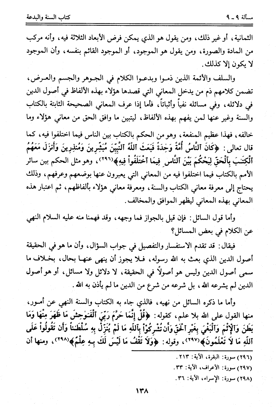 وَأَمَّا قَوْلُ السَّائِلِ: فَإِنْ قِيلَ بِالْجَوَازِ فَمَا وَجْهُهُ، وَقَدْ فَهِمْنَا مِنْهُ - عَلَيْهِ السَّلَامُ - النَّهْيَ عَنْ الْكَلَامِ فِي بَعْضِ الْمَسَائِلِ؟ فَيُقَالُ: قَدْ تَقَدَّمَ الِاسْتِفْسَارُ وَالتَّفْصِيلُ فِي جَوَابِ السُّؤَالِ، وَأَنَّ مَا هُوَ فِي الْحَقِيقَةِ أُصُولُ الدِّينِ الَّذِي بَعَثَ بِهِ اللَّهُ رَسُولَهُ، فَلَا يَجُوزُ أَنْ يُنْهَى عَنْهَا بِحَالٍ، بِخِلَافِ مَا سُمِّيَ أُصُولَ الدِّينِ وَلَيْسَ هُوَ أُصُولًا فِي الْحَقِيقَةِ، لَا دَلَائِلَ وَلَا مَسَائِلَ، أَوْ هُوَ أُصُولُ الدِّينِ لَمْ يَشْرَعْهُ اللَّهُ، بَلْ شَرَعَهُ مَنْ شَرَعَ مِنْ الدِّينِ مَا لَمْ يَأْذَنْ بِهِ اللَّهُ.