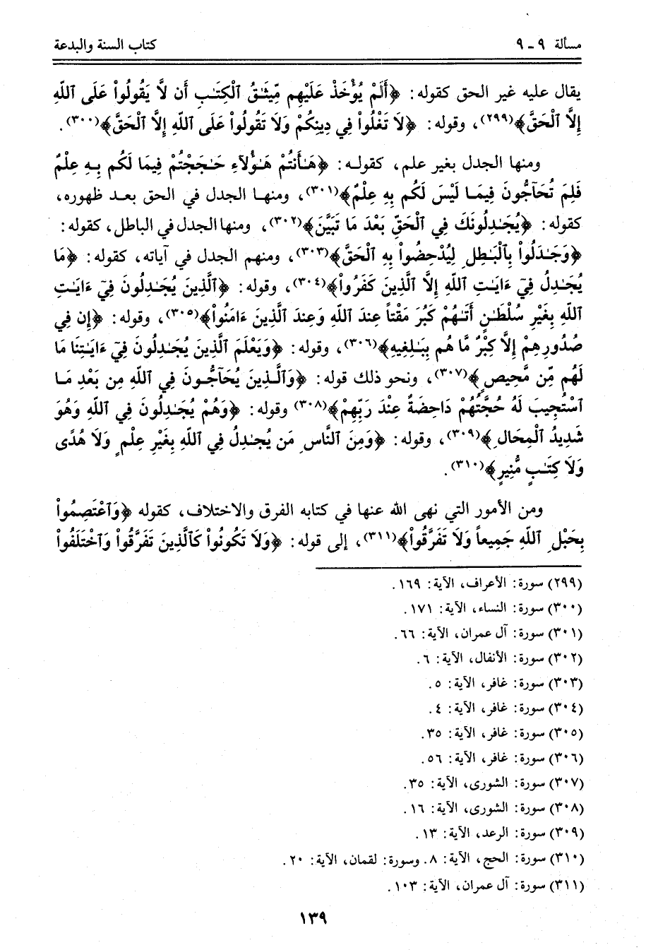 وَمِنْهَا الْجَدَلُ بِغَيْرِ عِلْمٍ، كَقَوْلِهِ: {هَا أَنْتُمْ هَؤُلاءِ حَاجَجْتُمْ فِيمَا لَكُمْ بِهِ عِلْمٌ فَلِمَ تُحَاجُّونَ فِيمَا لَيْسَ لَكُمْ بِهِ عِلْمٌ} [آل عمران: 66] ، وَمِنْهَا الْجَدَلُ فِي الْحَقِّ بَعْدَ ظُهُورِهِ، كَقَوْلِهِ: {يُجَادِلُونَكَ فِي الْحَقِّ بَعْدَمَا تَبَيَّنَ} [الأنفال: 6] ، وَمِنْهَا الْجَدَلُ فِي الْبَاطِلِ، كَقَوْلِهِ: {وَجَادَلُوا بِالْبَاطِلِ لِيُدْحِضُوا بِهِ الْحَقَّ} [غافر: 5] ، وَمِنْهَا الْجَدَلُ فِي آيَاتِهِ، كَقَوْلِهِ: {مَا يُجَادِلُ فِي آيَاتِ اللَّهِ إِلا الَّذِينَ كَفَرُوا} [غافر: 4] ، وَقَوْلِهِ: {الَّذِينَ يُجَادِلُونَ فِي آيَاتِ اللَّهِ بِغَيْرِ سُلْطَانٍ أَتَاهُمْ كَبُرَ مَقْتًا عِنْدَ اللَّهِ وَعِنْدَ الَّذِينَ آمَنُوا} [غافر: 35] ، وَقَوْلِهِ: {إِنْ فِي صُدُورِهِمْ إِلا كِبْرٌ مَا هُمْ بِبَالِغِيهِ} [غافر: 56] ، وَقَوْلِهِ: {وَيَعْلَمَ الَّذِينَ يُجَادِلُونَ فِي آيَاتِنَا مَا لَهُمْ مِنْ مَحِيصٍ} [الشورى: 35] ، وَنَحْوُ ذَلِكَ قَوْلُهُ: {وَالَّذِينَ يُحَاجُّونَ فِي اللَّهِ مِنْ بَعْدِ مَا اسْتُجِيبَ لَهُ حُجَّتُهُمْ دَاحِضَةٌ عِنْدَ رَبِّهِمْ} [الشورى: 16] وَقَوْلُهُ: {وَهُمْ يُجَادِلُونَ فِي اللَّهِ وَهُوَ شَدِيدُ الْمِحَالِ} [الرعد: 13] ، وَقَوْلُهُ: {وَمِنَ النَّاسِ مَنْ يُجَادِلُ فِي اللَّهِ بِغَيْرِ عِلْمٍ وَلا هُدًى وَلا كِتَابٍ مُنِيرٍ} [الحج: 8] .
