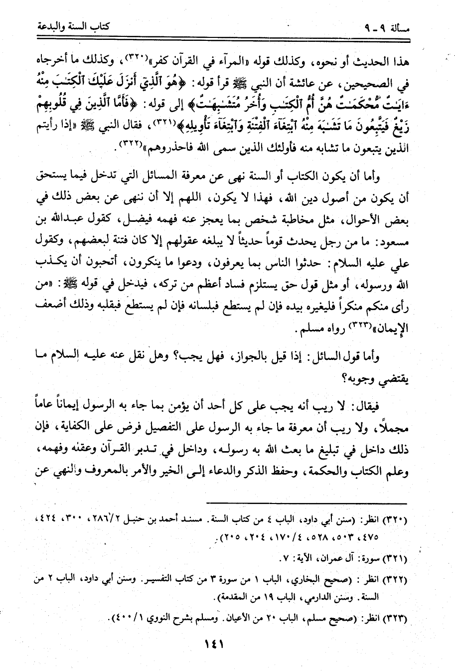 وَإِمَّا أَنْ يَكُونَ الْكِتَابُ أَوْ السُّنَّةُ نَهَى عَنْ مَعْرِفَةِ الْمَسَائِلِ الَّتِي تَدْخُلُ فِيمَا يَسْتَحِقُّ أَنْ يَكُونَ مِنْ أُصُولِ دِينِ اللَّهِ، فَهَذَا لَا يَكُونُ، اللَّهُمَّ إلَّا أَنْ نُنْهَى عَنْ بَعْضِ ذَلِكَ فِي بَعْضِ الْأَحْوَالِ، مِثْلُ مُخَاطَبَةِ شَخْصٍ بِمَا يَعْجِزُ عَنْهُ فَهْمُهُ فَيَضِلُّ، كَقَوْلِ عَبْدِ اللَّهِ بْنِ مَسْعُودٍ: مَا مِنْ رَجُلٍ يُحَدِّثُ قَوْمًا حَدِيثًا لَا تَبْلُغُهُ عُقُولُهُمْ إلَّا كَانَ فِتْنَةً لِبَعْضِهِمْ، وَكَقَوْلِ عَلِيٍّ - عَلَيْهِ السَّلَامُ -: حَدِّثُوا النَّاسَ بِمَا يَعْرِفُونَ، وَدَعُوا مَا يُنْكِرُونَ، أَتُحِبُّونَ أَنْ يُكَذَّبَ اللَّهُ وَرَسُولُهُ، أَوْ مِثْلُ قَوْلِ حَقٍّ يَسْتَلْزِمُ فَسَادًا أَعْظَمَ مِنْ تَرْكِهِ، فَيَدْخُلُ فِي قَوْلِهِ - صَلَّى اللَّهُ عَلَيْهِ وَسَلَّمَ -: «مَنْ رَأَى مِنْكُمْ مُنْكَرًا فَلْيُغَيِّرْهُ بِيَدِهِ فَإِنْ لَمْ يَسْتَطِعْ فَبِلِسَانِهِ فَإِنْ لَمْ يَسْتَطِعْ فَبِقَلْبِهِ وَذَلِكَ أَضْعَفُ الْإِيمَانِ» رَوَاهُ مُسْلِمٌ.
