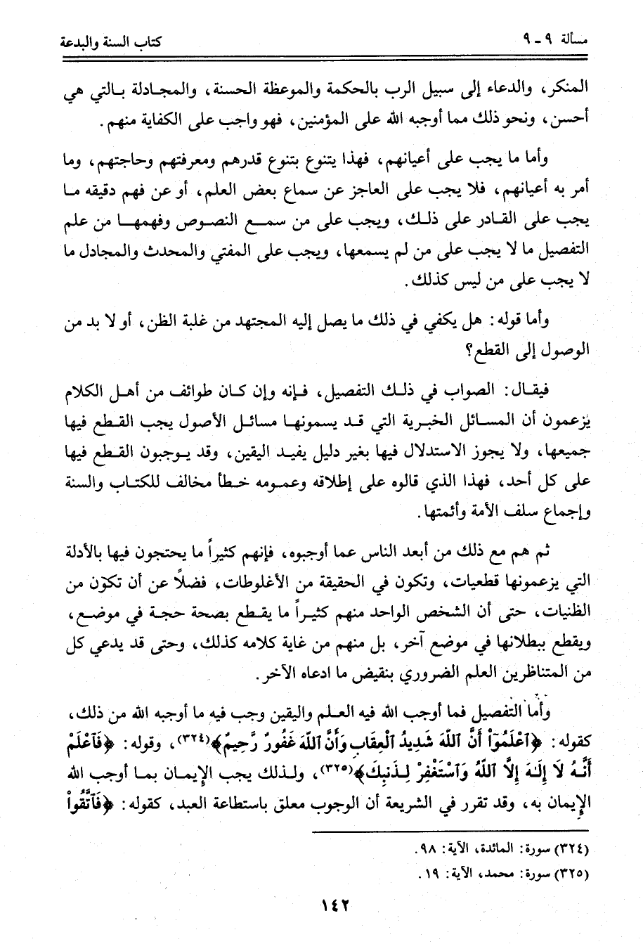 وَأَمَّا التَّفْصِيلُ فَمَا أَوْجَبَ اللَّهُ فِيهِ الْعِلْمَ وَالْيَقِينَ وَجَبَ فِيهِ مَا أَوْجَبَهُ اللَّهُ مِنْ ذَلِكَ، كَقَوْلِهِ: {اعْلَمُوا أَنَّ اللَّهَ شَدِيدُ الْعِقَابِ وَأَنَّ اللَّهَ غَفُورٌ رَحِيمٌ} [المائدة: 98] ، وَقَوْلِهِ: {فَاعْلَمْ أَنَّهُ لا إِلَهَ إِلا اللَّهُ وَاسْتَغْفِرْ لِذَنْبِكَ} [محمد: 19] ، وَلِذَلِكَ يَجِبُ الْإِيمَانُ بِمَا أَوْجَبَ اللَّهُ الْإِيمَانَ بِهِ، وَقَدْ تَقَرَّرَ فِي الشَّرِيعَةِ أَنَّ الْوُجُوبَ مُعَلَّقٌ بِاسْتِطَاعَةِ الْعَبْدِ، كَقَوْلِهِ: {فَاتَّقُوا اللَّهَ مَا اسْتَطَعْتُمْ} [التغابن: 16]
