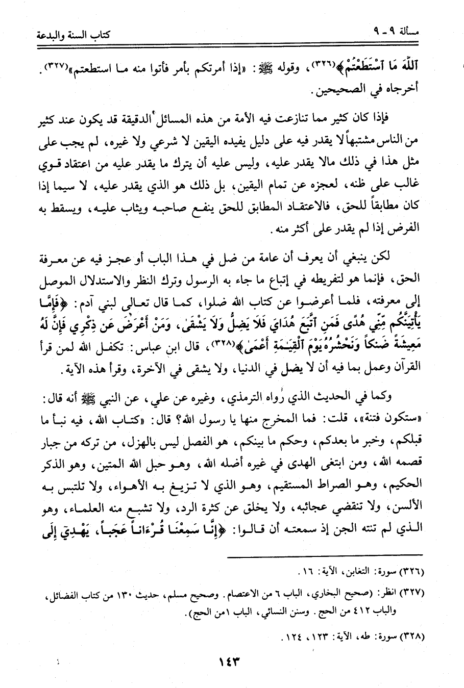 ، وَقَوْلِهِ - صَلَّى اللَّهُ عَلَيْهِ وَسَلَّمَ -: «إذَا أَمَرْتُكُمْ بِأَمْرٍ فَأْتُوا مِنْهُ مَا اسْتَطَعْتُمْ» . أَخْرَجَاهُ فِي الصَّحِيحَيْنِ. فَإِذَا كَانَ كَثِيرٌ مِمَّا تَنَازَعْت فِيهِ الْأُمَّةُ مِنْ هَذِهِ الْمَسَائِلِ الدَّقِيقَةِ قَدْ يَكُونُ عِنْدَ كَثِيرٍ مِنْ النَّاسِ مُشْتَبِهًا لَا يَقْدِرُ فِيهِ عَلَى دَلِيلٍ يُفِيدُهُ الْيَقِينَ لَا شَرْعِيٌّ وَلَا غَيْرُهُ، لَمْ يَجِبْ عَلَى مِثْلِ هَذَا فِي ذَلِكَ مَا لَا يَقْدِرُ عَلَيْهِ، وَلَيْسَ عَلَيْهِ أَنْ يَتْرُكَ مَا يَقْدِرُ عَلَيْهِ مِنْ اعْتِقَادٍ قَوِيٍّ غَالِبٍ عَلَى ظَنِّهِ؛ لِعَجْزِهِ عَنْ تَمَامِ الْيَقِينِ، بَلْ ذَلِكَ هُوَ الَّذِي يَقْدِرُ عَلَيْهِ، لَا سِيَّمَا إذَا كَانَ مُطَابِقًا لِلْحَقِّ، فَالِاعْتِقَادُ الْمُطَابِقُ لِلْحَقِّ يَنْفَعُ صَاحِبَهُ وَيُثَابُ عَلَيْهِ، وَيَسْقُطُ بِهِ الْفَرْضُ إذَا لَمْ يَقْدِرْ عَلَى أَكْثَرَ مِنْهُ.
