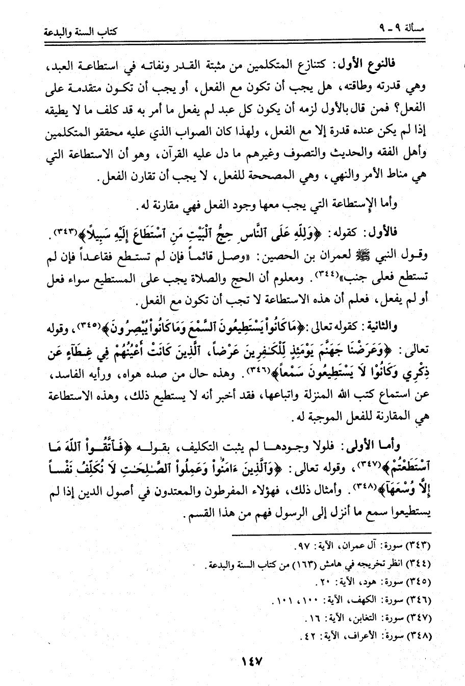 فَالنَّوْعُ الْأَوَّلُ: كَتَنَازُعِ الْمُتَكَلِّمِينَ مِنْ مُثْبِتَةِ الْقَدَرِ وَنُفَاتِهِ فِي اسْتِطَاعَةِ الْعَبْدِ، وَهِيَ قُدْرَتُهُ وَطَاقَتُهُ، هَلْ يَجِبُ أَنْ تَكُونَ مَعَ الْفِعْلِ، أَوْ يَجِبُ أَنْ تَكُونَ مُتَقَدِّمَةً عَلَى الْفِعْلِ؟ فَمَنْ قَالَ بِالْأَوَّلِ لَزِمَهُ أَنْ يَكُونَ كُلُّ عَبْدٍ لَمْ يَفْعَلْ مَا أُمِرَ بِهِ قَدْ كُلِّفَ مَا لَا يُطِيقُهُ إذَا لَمْ يَكُنْ عِنْدَهُ قُدْرَةٌ إلَّا مَعَ الْفِعْلِ، وَلِهَذَا كَانَ الصَّوَابُ الَّذِي عَلَيْهِ مُحَقِّقُو الْمُتَكَلِّمِينَ وَأَهْلُ الْفِقْهِ وَالْحَدِيثِ وَالتَّصَوُّفِ وَغَيْرِهِمْ مَا دَلَّ عَلَيْهِ الْقُرْآنُ، وَهُوَ أَنَّ الِاسْتِطَاعَةَ الَّتِي هِيَ مَنَاطُ الْأَمْرِ وَالنَّهْيِ، وَهِيَ الْمُصَحِّحَةُ لِلْفِعْلِ، لَا يَجِبُ أَنْ تُقَارِنَ الْفِعْلَ. وَأَمَّا الِاسْتِطَاعَةُ الَّتِي يَجِبُ مَعَهَا وُجُودُ الْفِعْلِ فَهِيَ مُقَارِنَةٌ لَهُ.